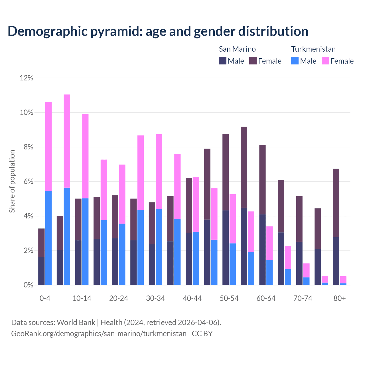 - The share of young demographic (0-15 years old) in San Marino is 12.3% vs 31.5% in Turkmenistan.