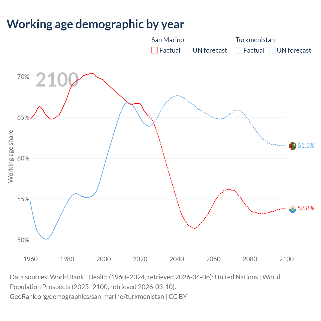 - San Marino has 22.2K working age adults (aged 15-64) vs 4.97M in Turkmenistan.