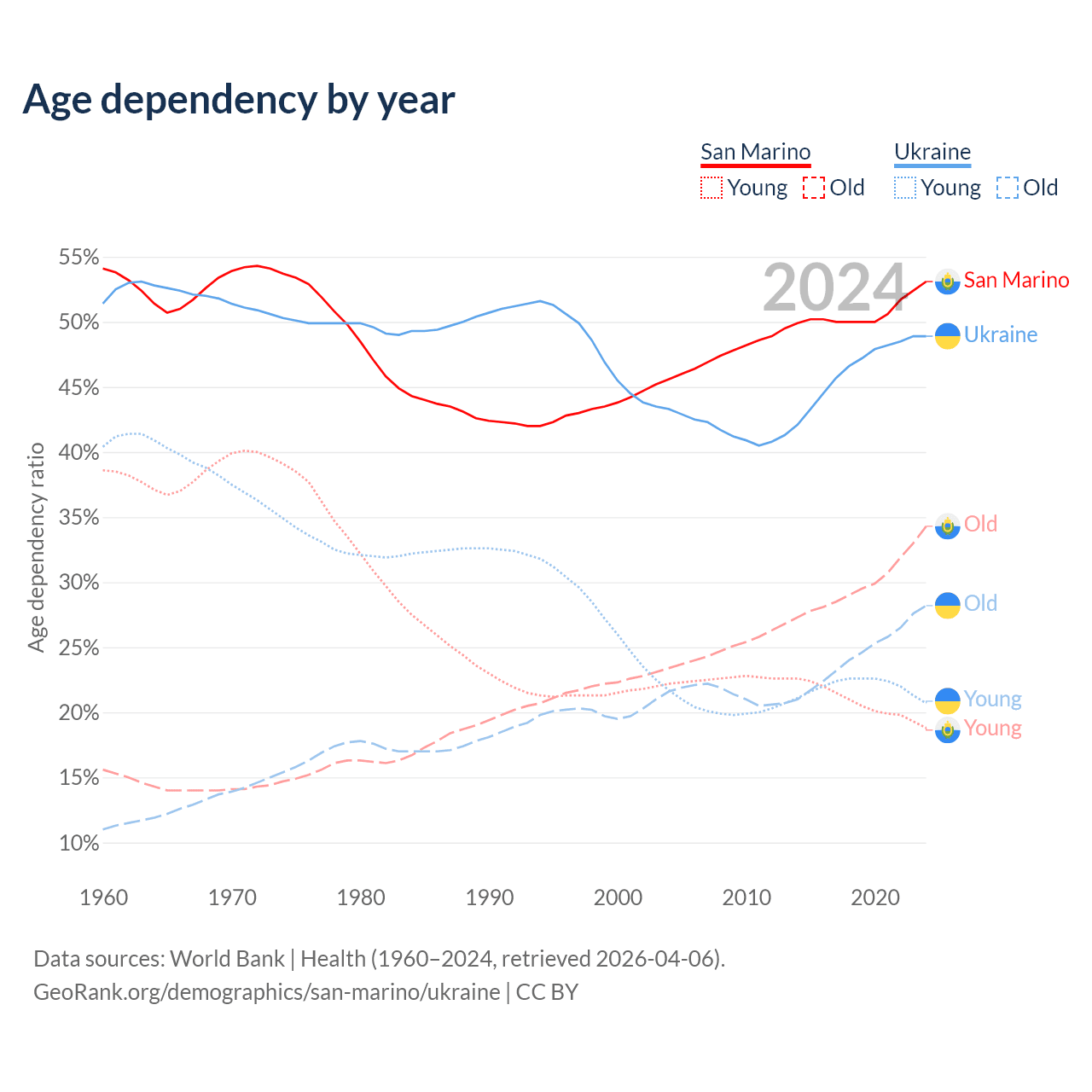 - San Marino is ranked 3/196 by median age (oldest to youngest) vs 26/196 for Ukraine.