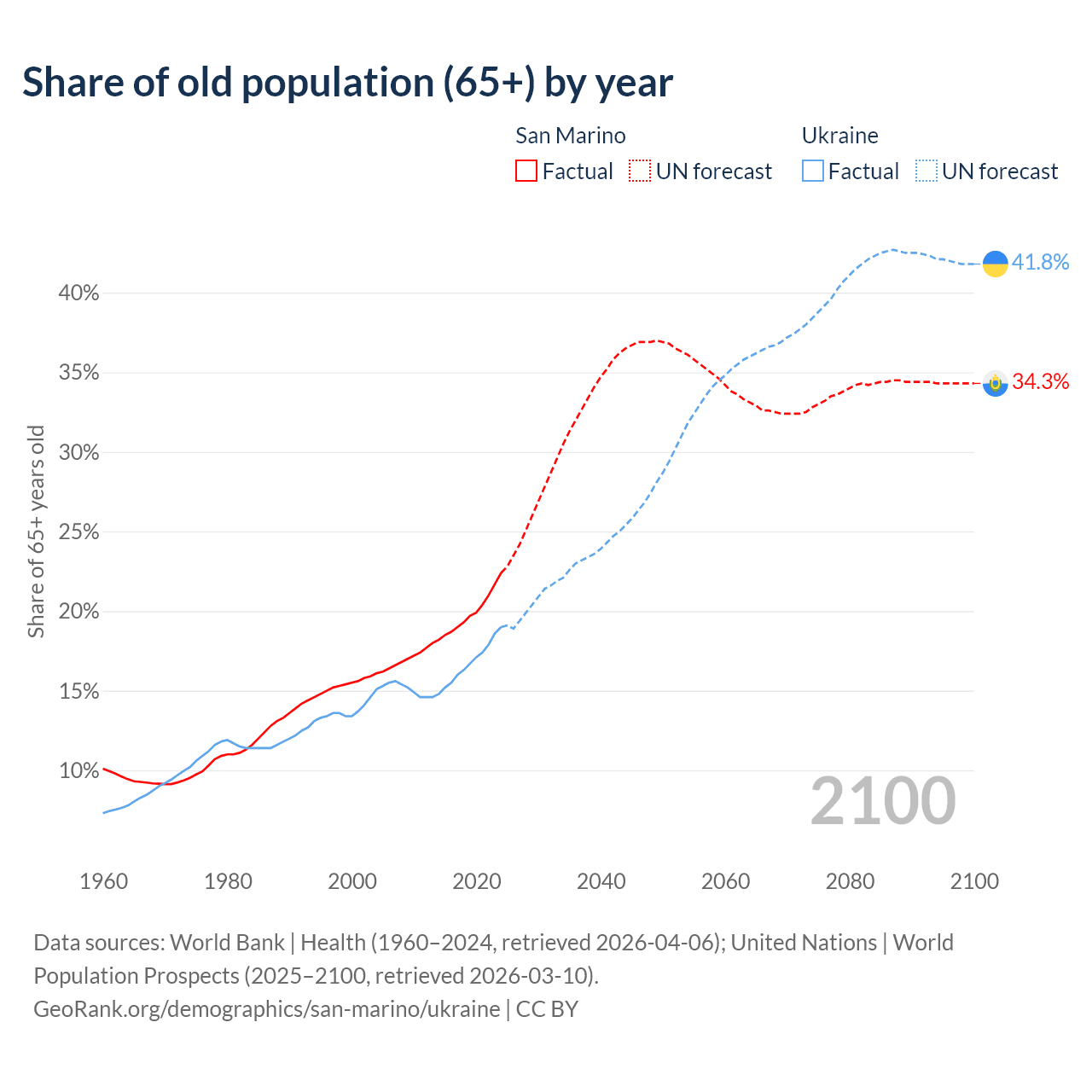 - The share of old-age demographic (65+) in San Marino is 22.4% vs 19% in Ukraine.