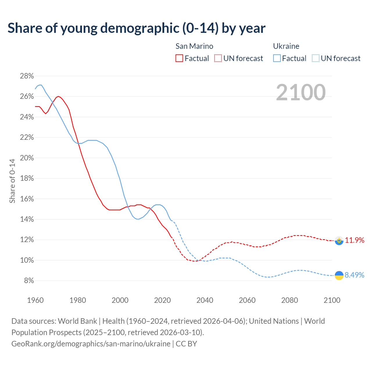 - The share of young demographic (0-15 years old) in San Marino is 12.3% vs 13.9% in Ukraine.