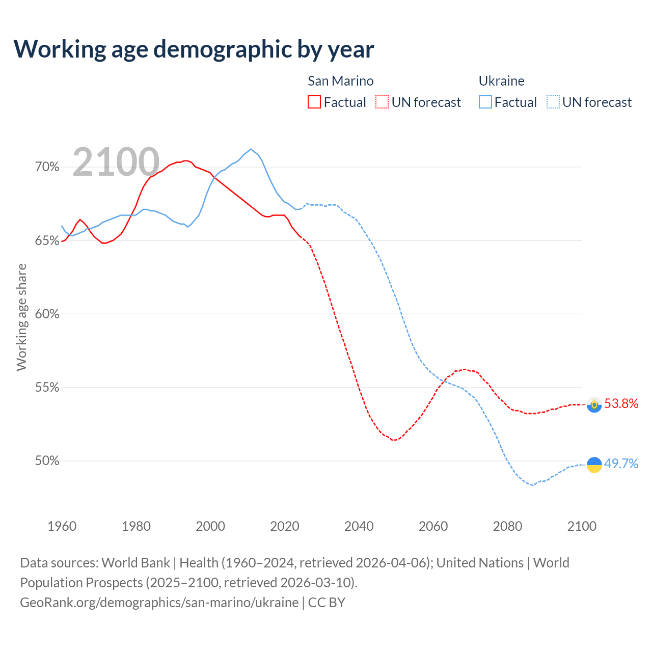 - San Marino has 22.2K working age adults (aged 15-64) vs 26.9M in Ukraine.