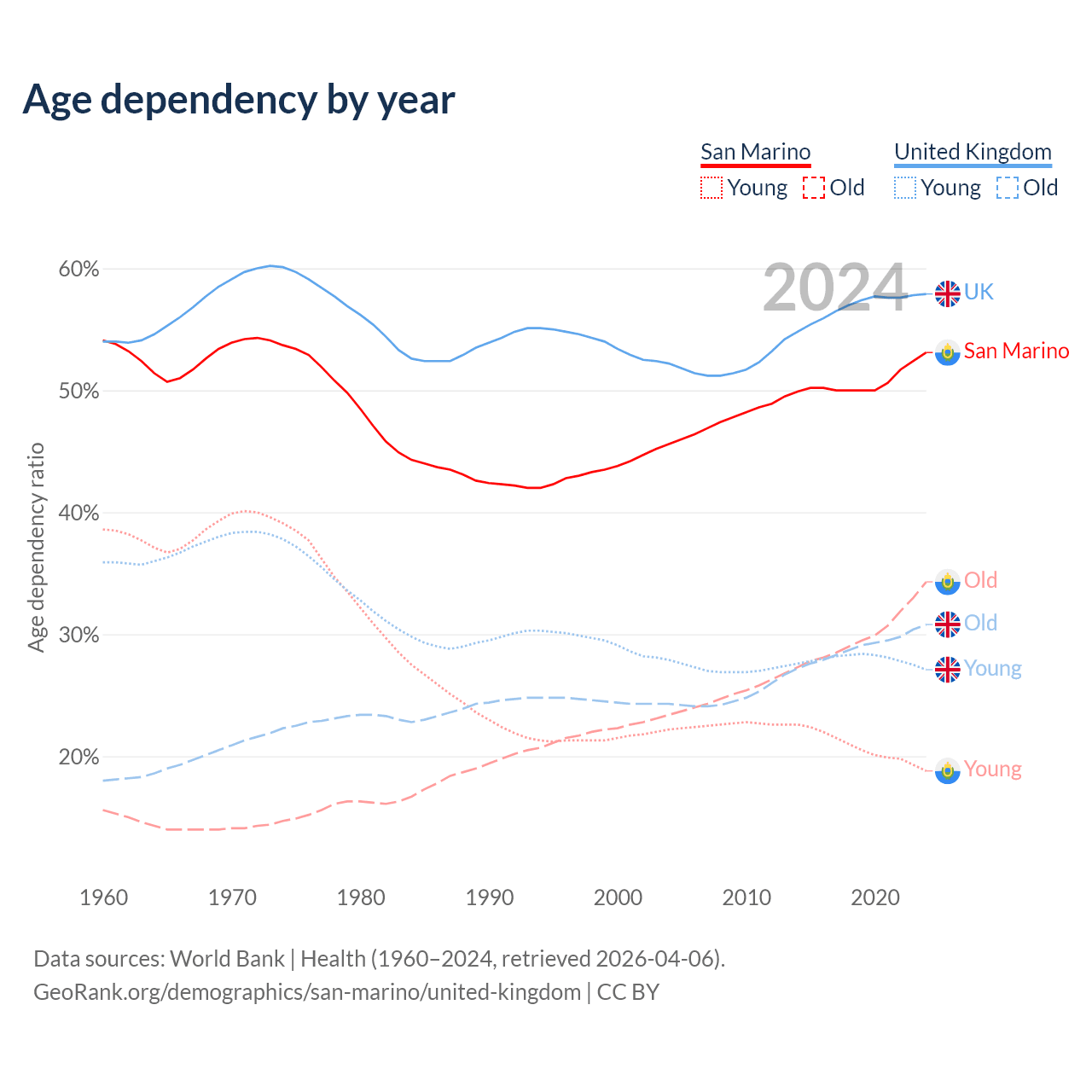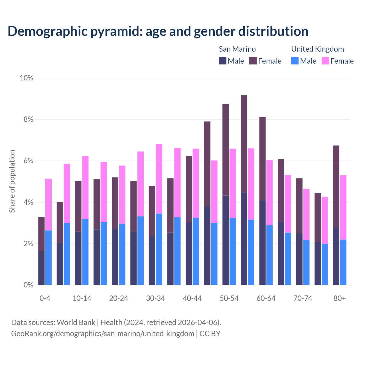 The share of older people aged 65 and over is 22.4% in San Marino and 19.5% in the United Kingdom. Life expectancy in San Marino compared to the United Kingdom .
