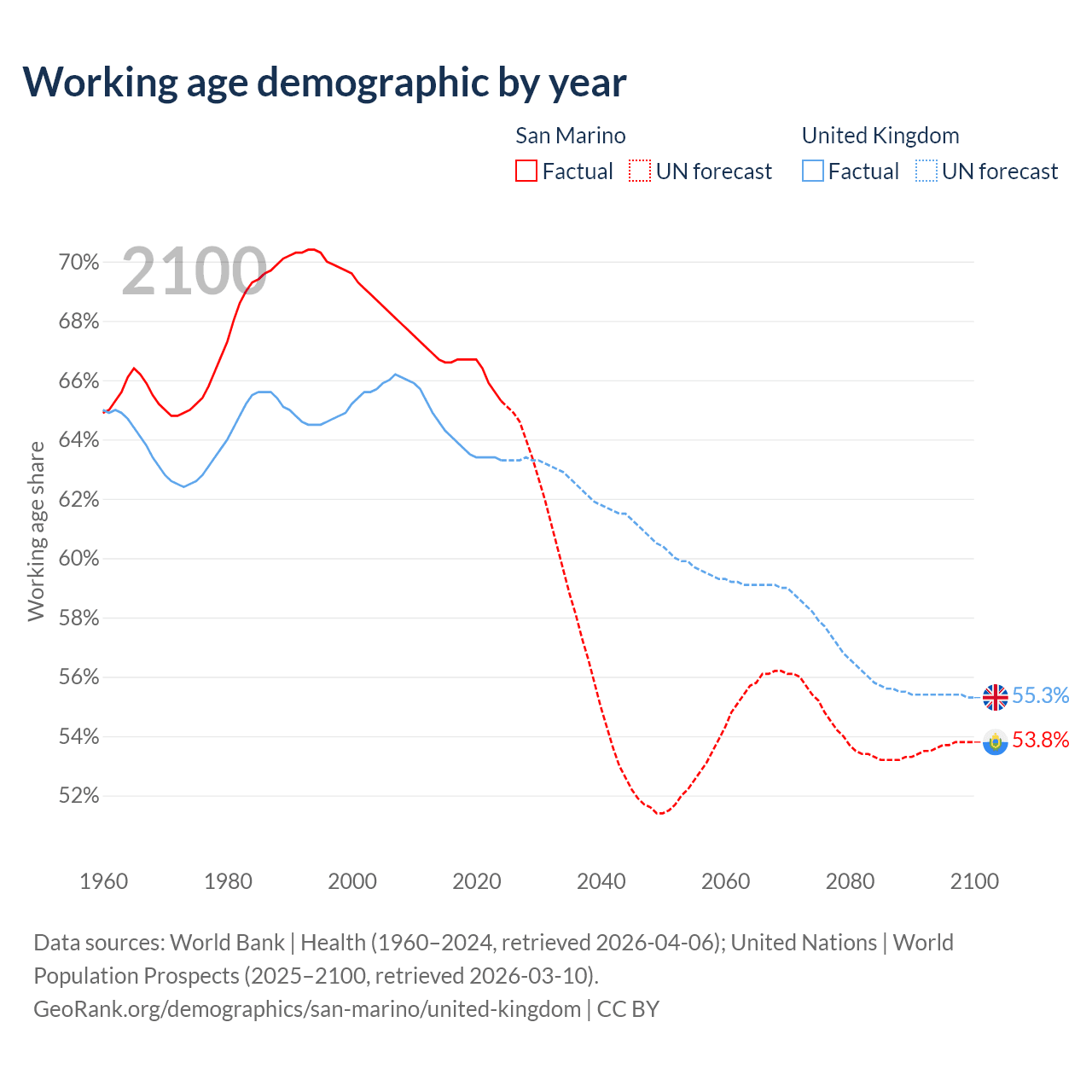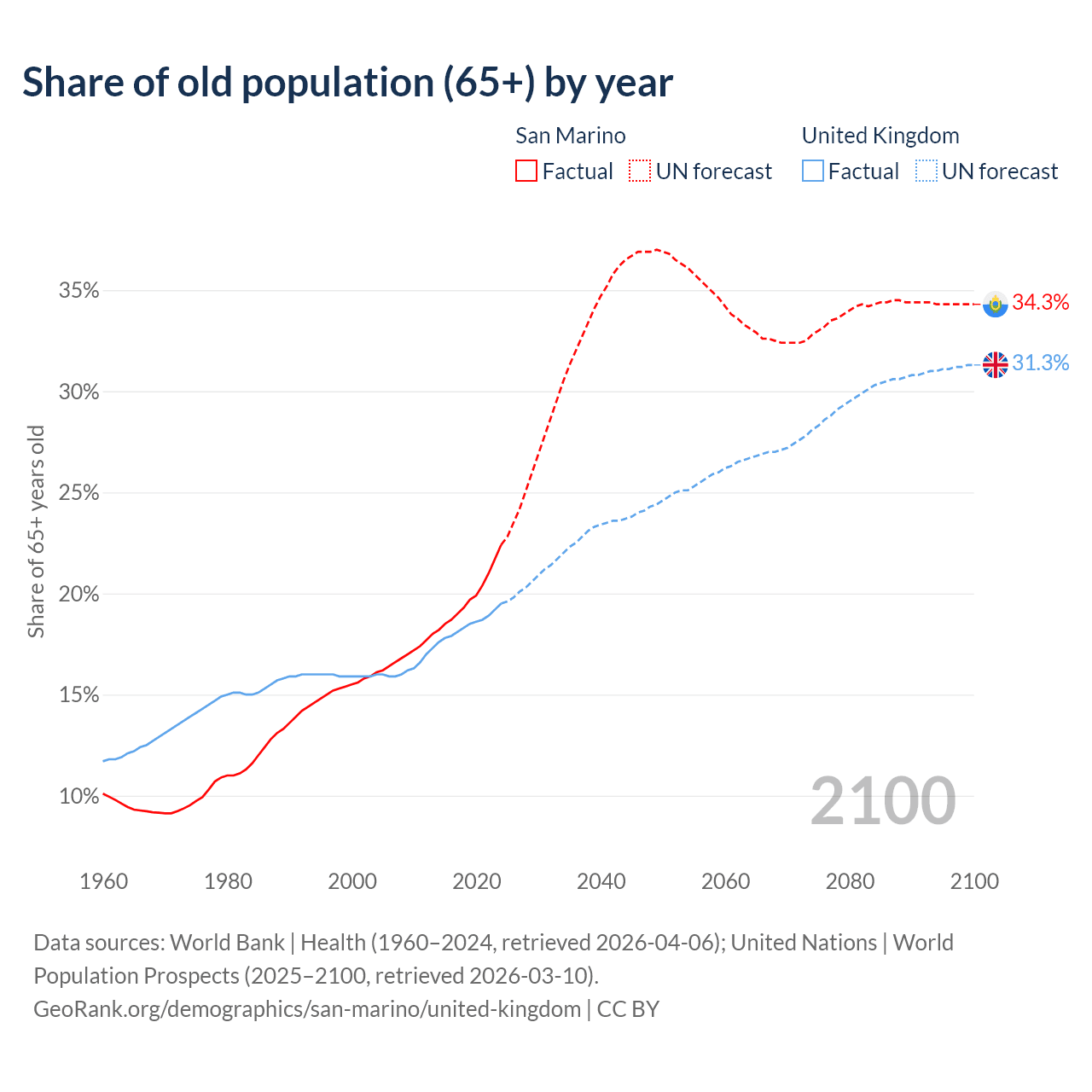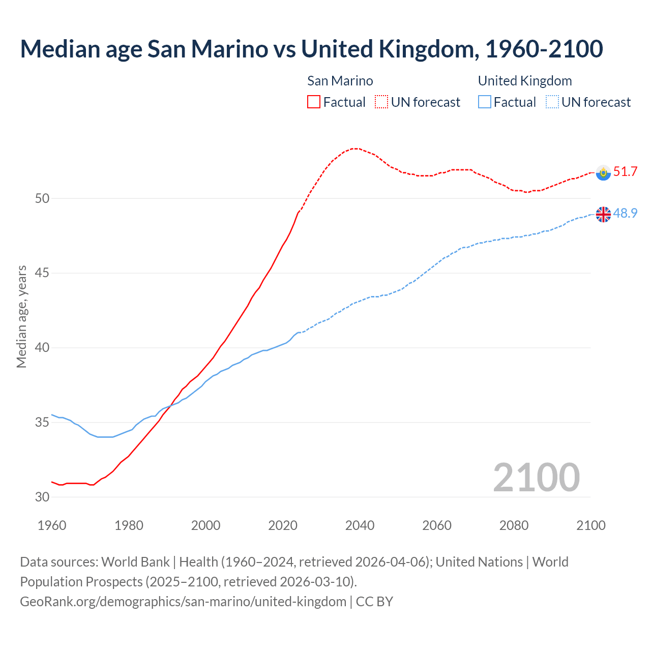 Median age San Marino vs United Kingdom, 1960-2100