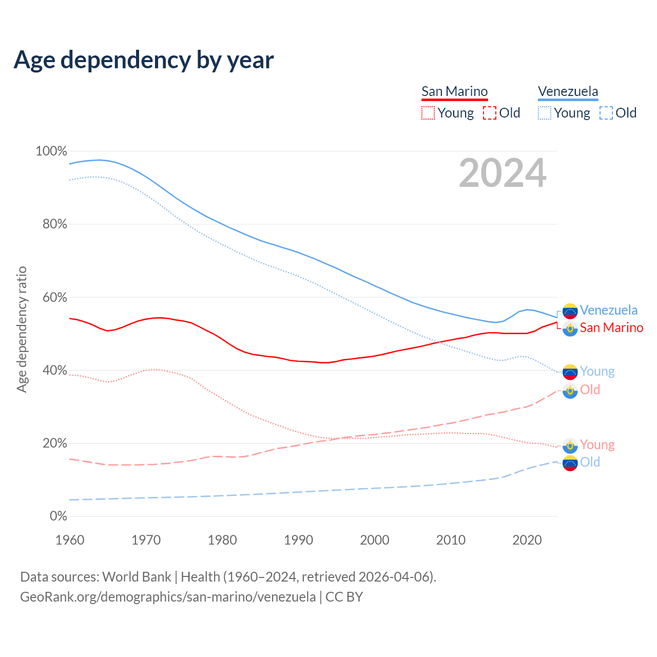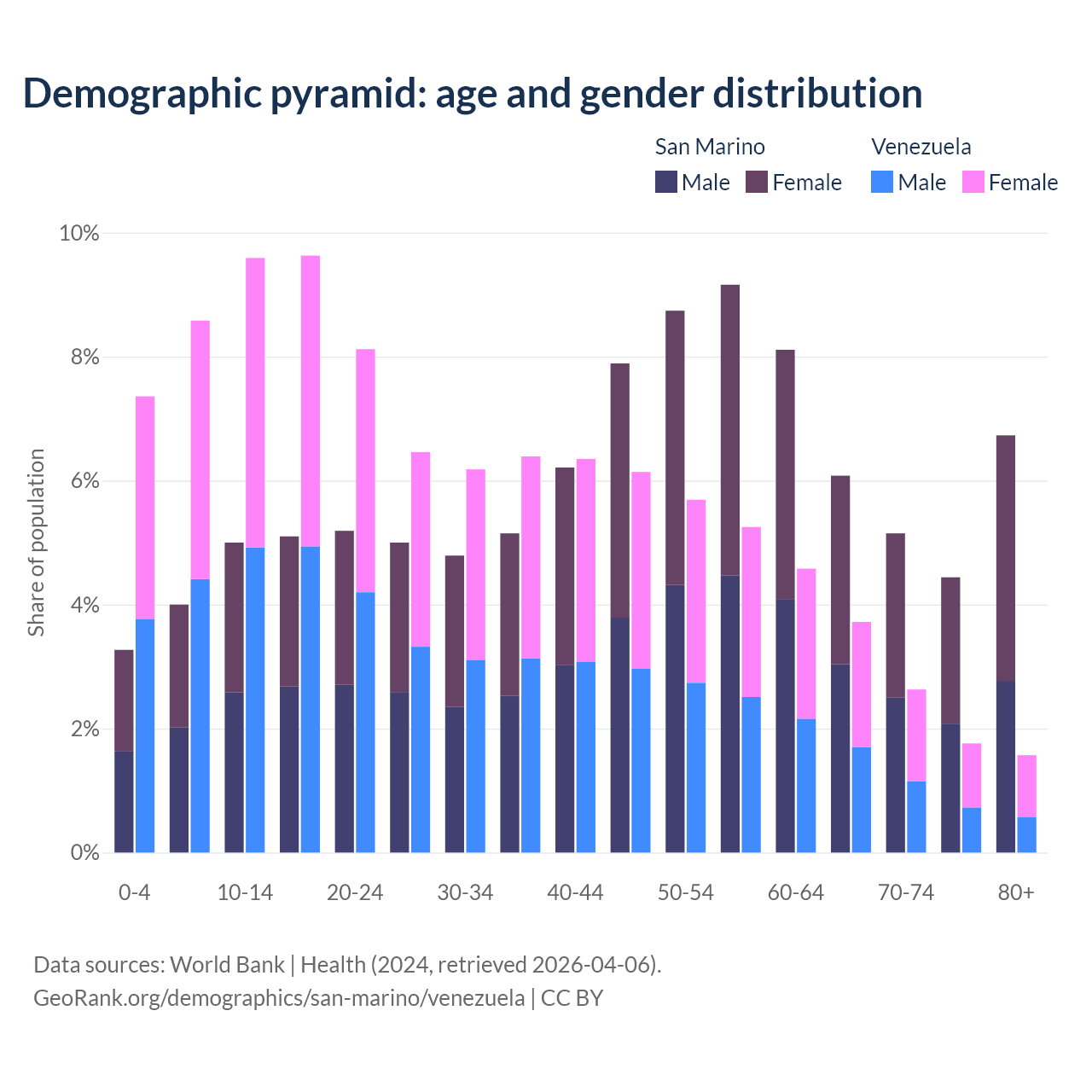 - The share of old-age demographic (65+) in San Marino is 22.4% vs 9.68% in Venezuela.