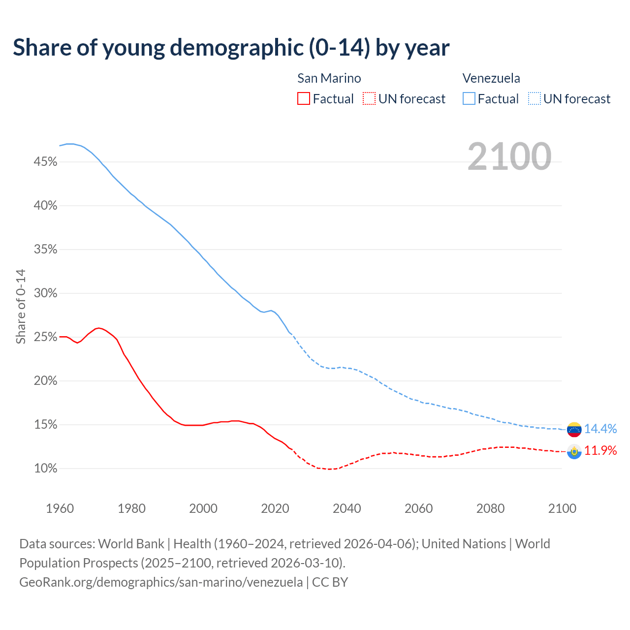 - The share of young demographic (0-15 years old) in San Marino is 12.3% vs 25.5% in Venezuela.
