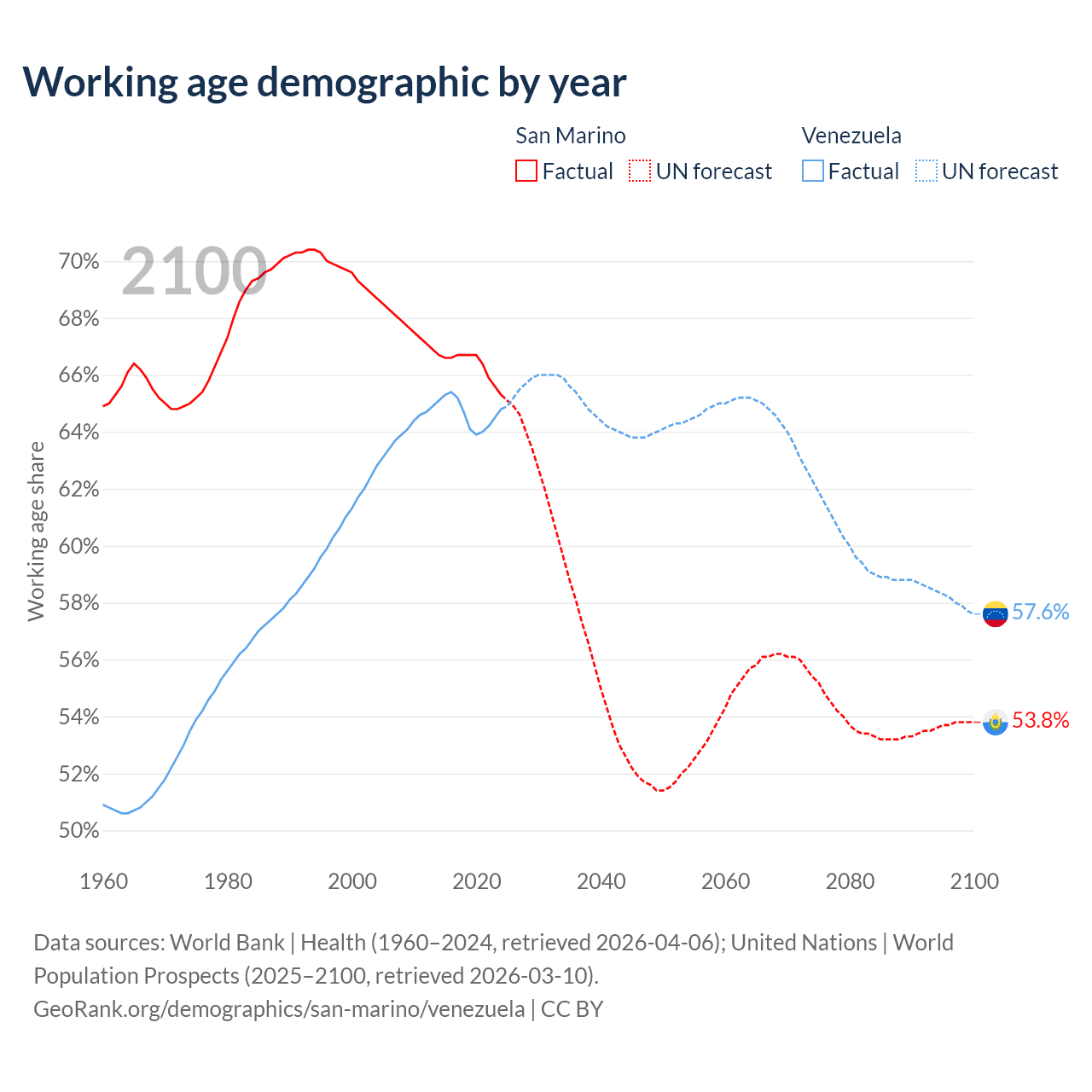 - San Marino has 22.2K working age adults (aged 15-64) vs 18.6M in Venezuela.