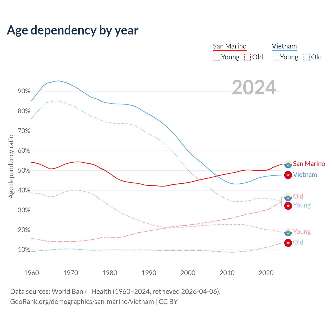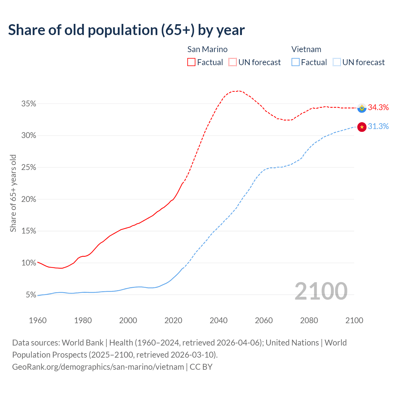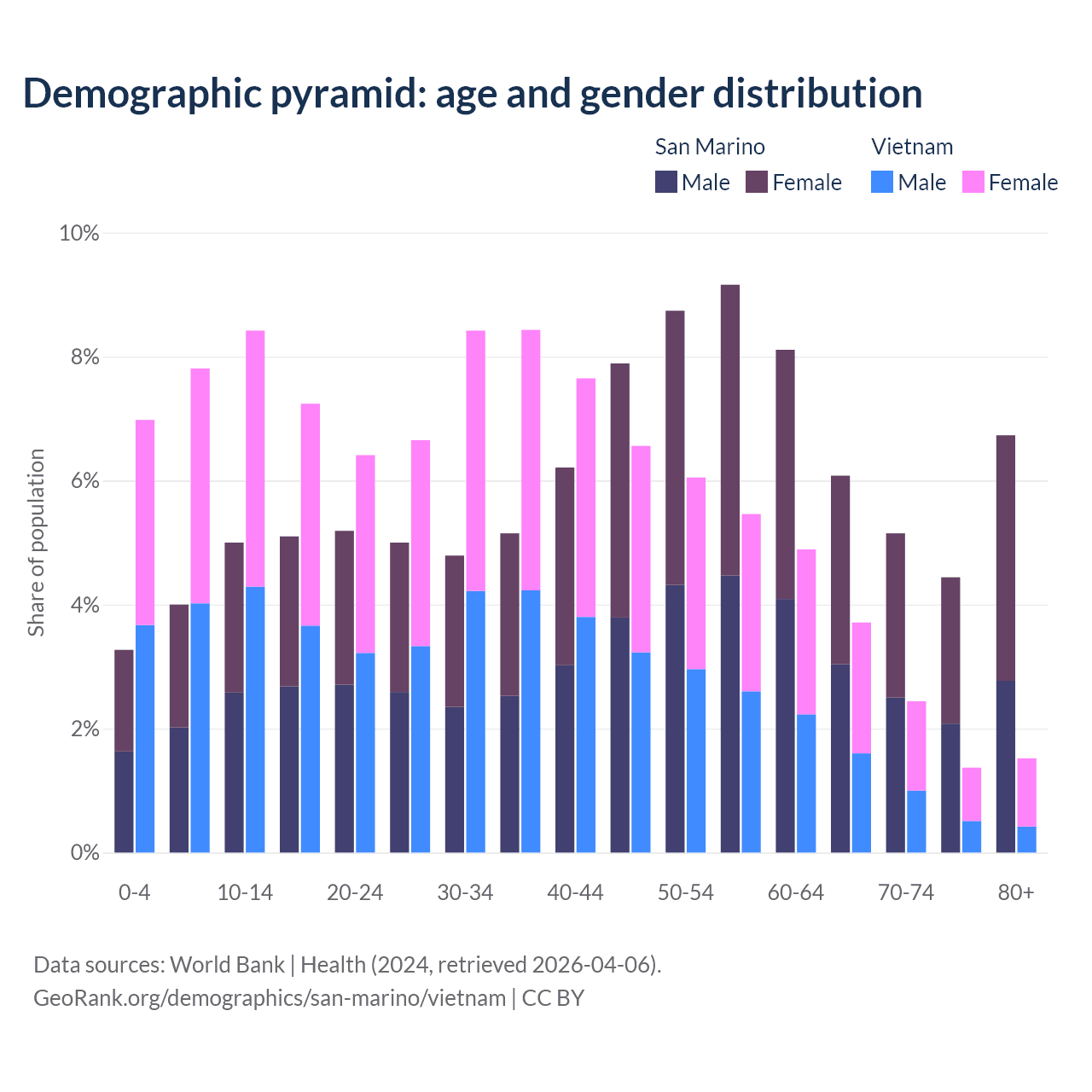 - The share of old-age demographic (65+) in San Marino is 22.4% vs 9.05% in Vietnam.
