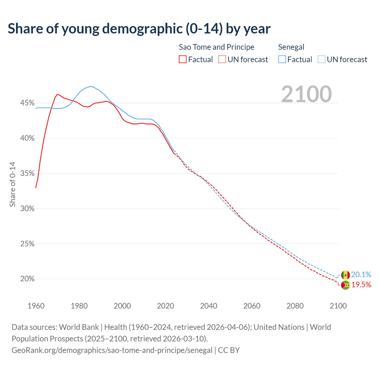 - The share of young demographic (0-15 years old) in Sao Tome and Principe is 37.8% vs 38.2% in Senegal.