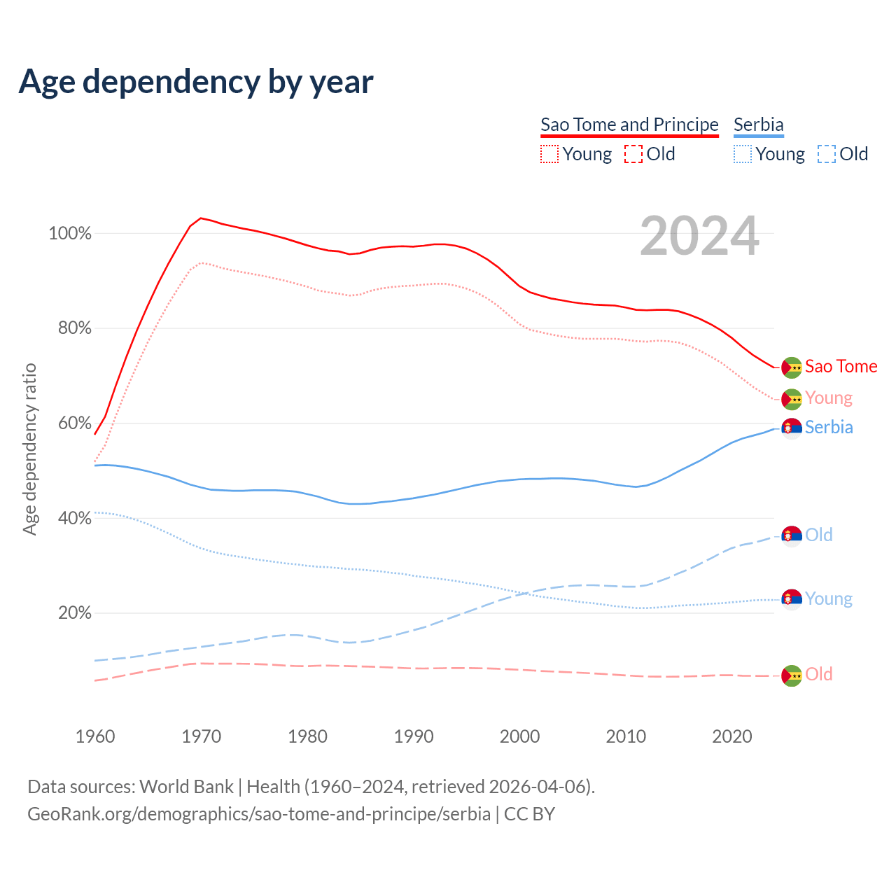 - The share of old-age demographic (65+) in Sao Tome and Principe is 3.9% vs 22.7% in Serbia.