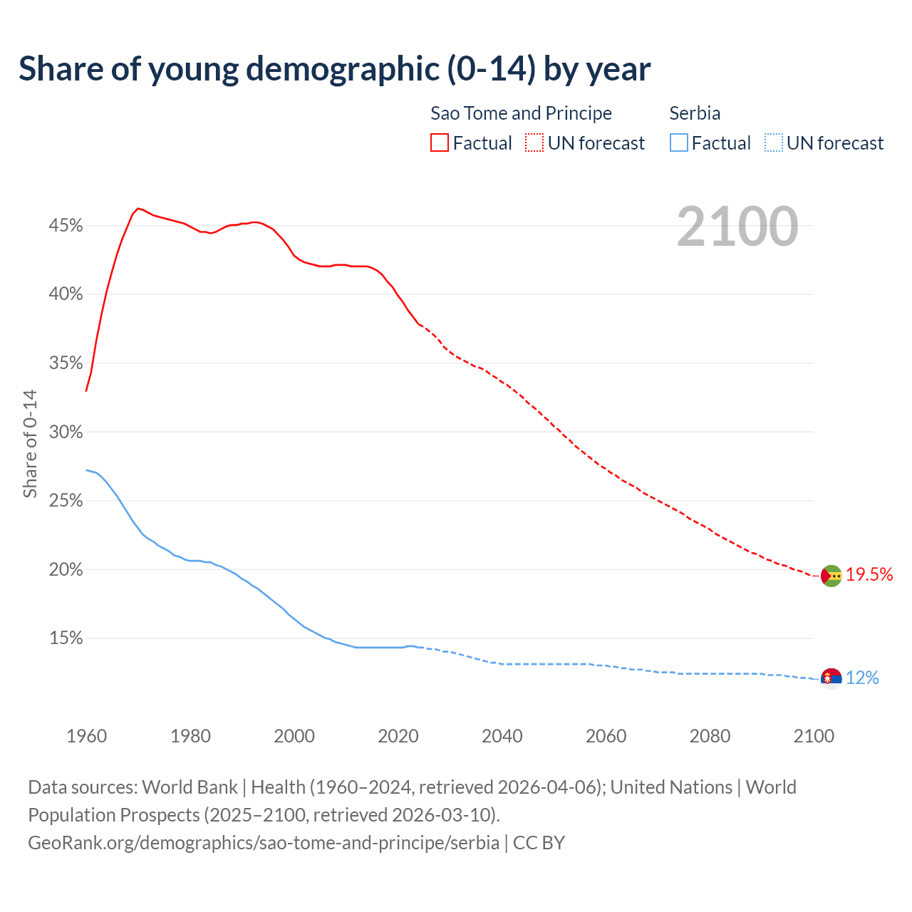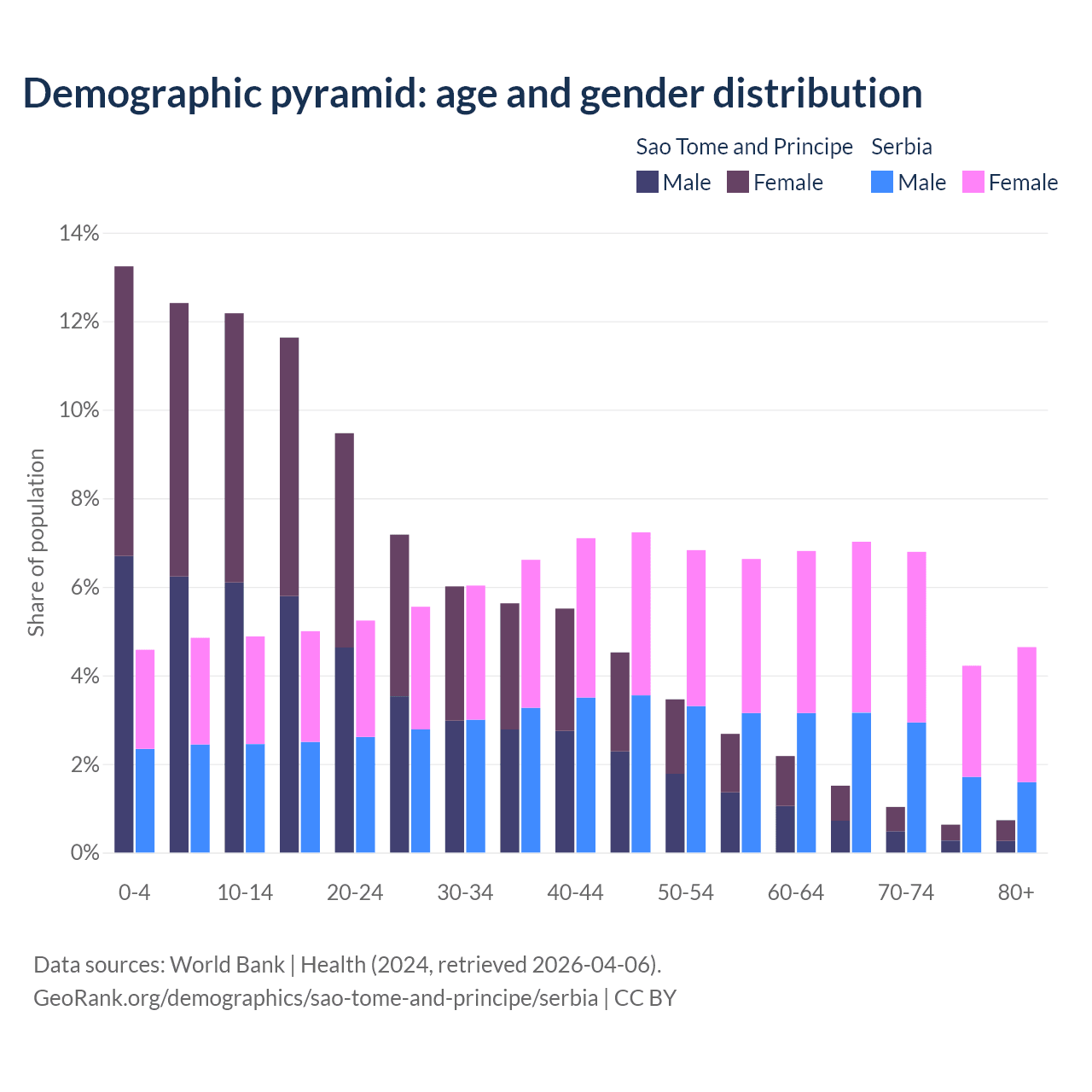 - The share of young demographic (0-15 years old) in Sao Tome and Principe is 37.8% vs 14.3% in Serbia.