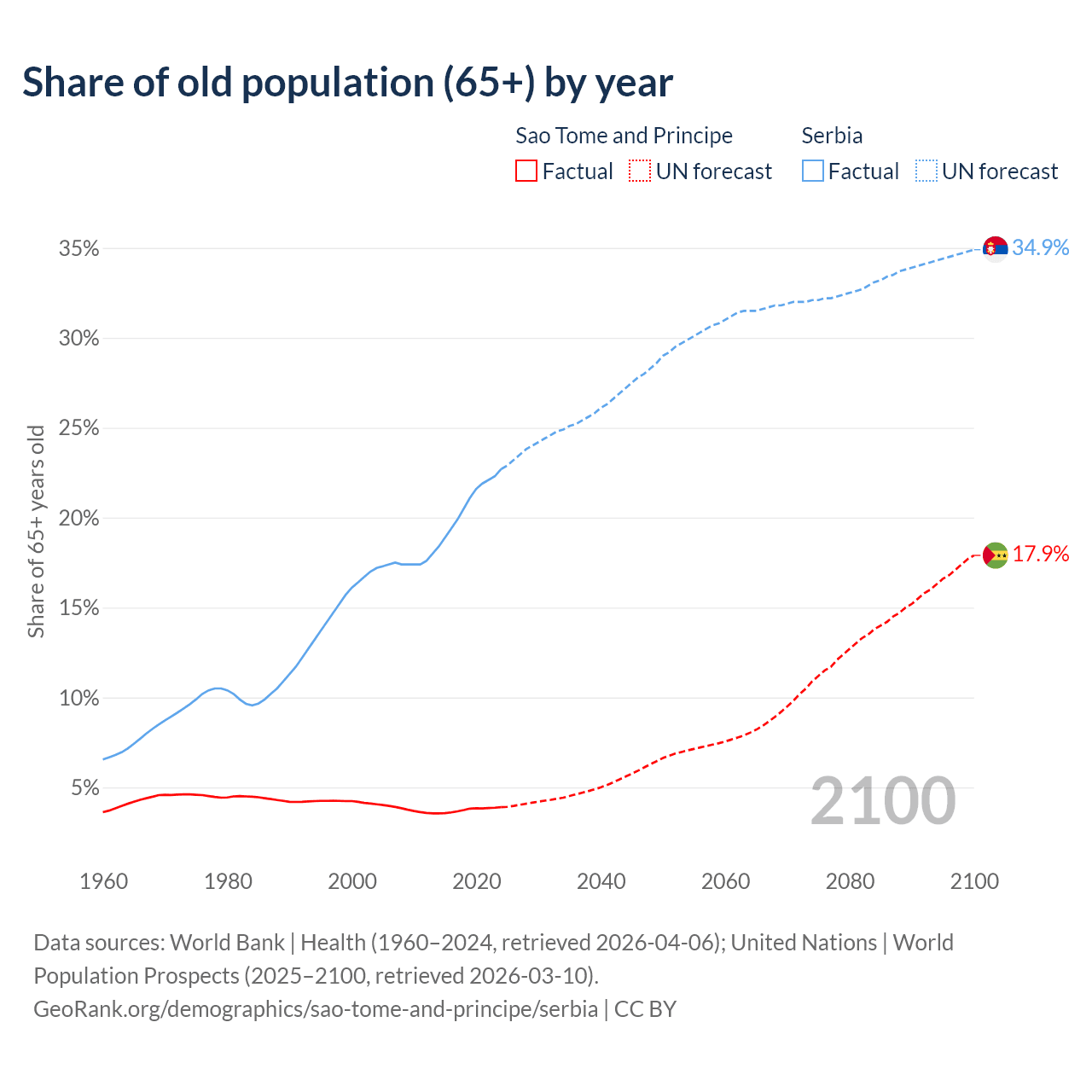The share of older people aged 65 and over is 3.9% in Sao Tome and Principe and 22.7% in Serbia. Life expectancy in Sao Tome and Principe compared to Serbia .
