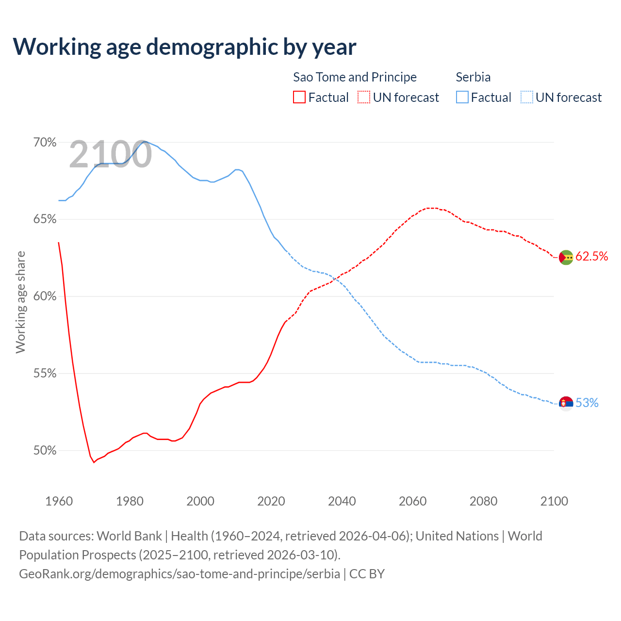 - Sao Tome and Principe has 144K working age adults (aged 15-64) vs 4.09M in Serbia.