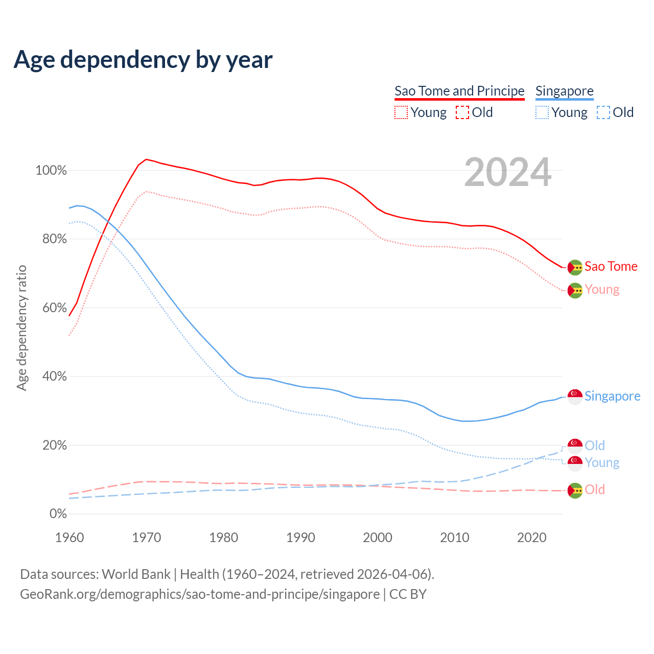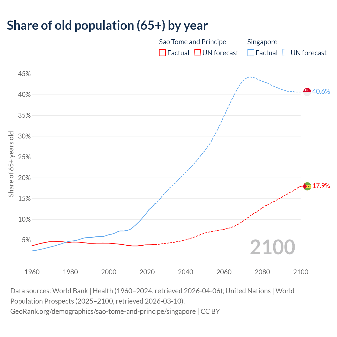 - The share of old-age demographic (65+) in Sao Tome and Principe is 3.9% vs 13.7% in Singapore.