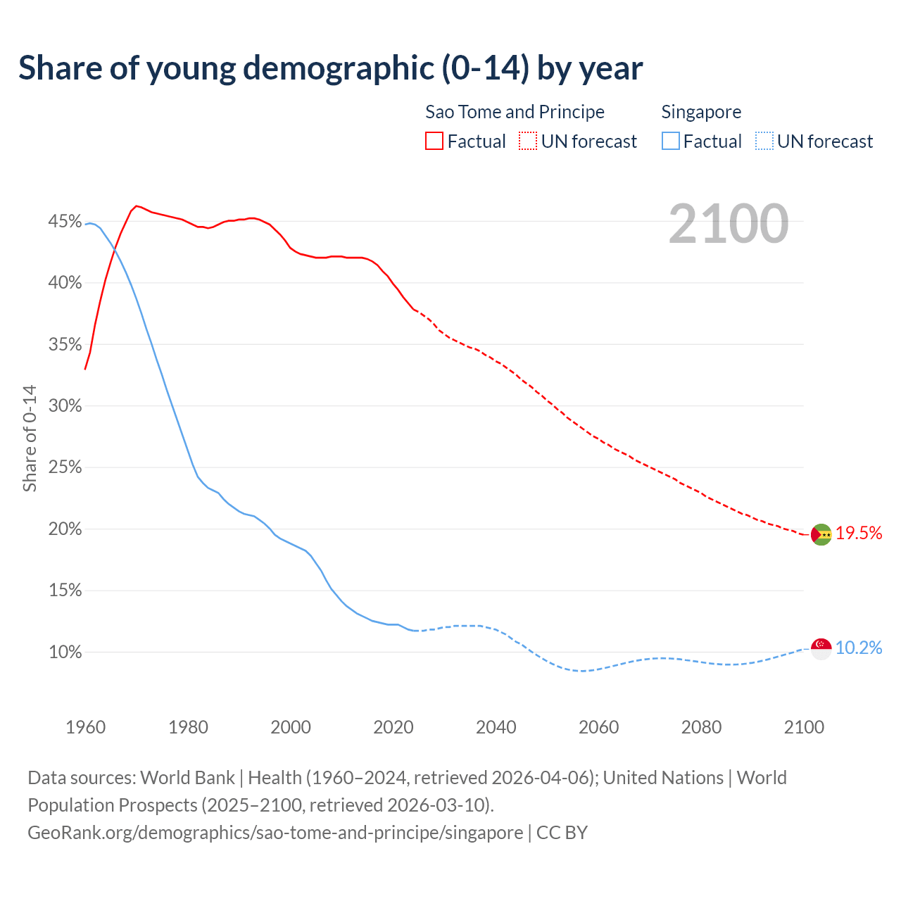 - The share of young demographic (0-15 years old) in Sao Tome and Principe is 37.8% vs 11.7% in Singapore.