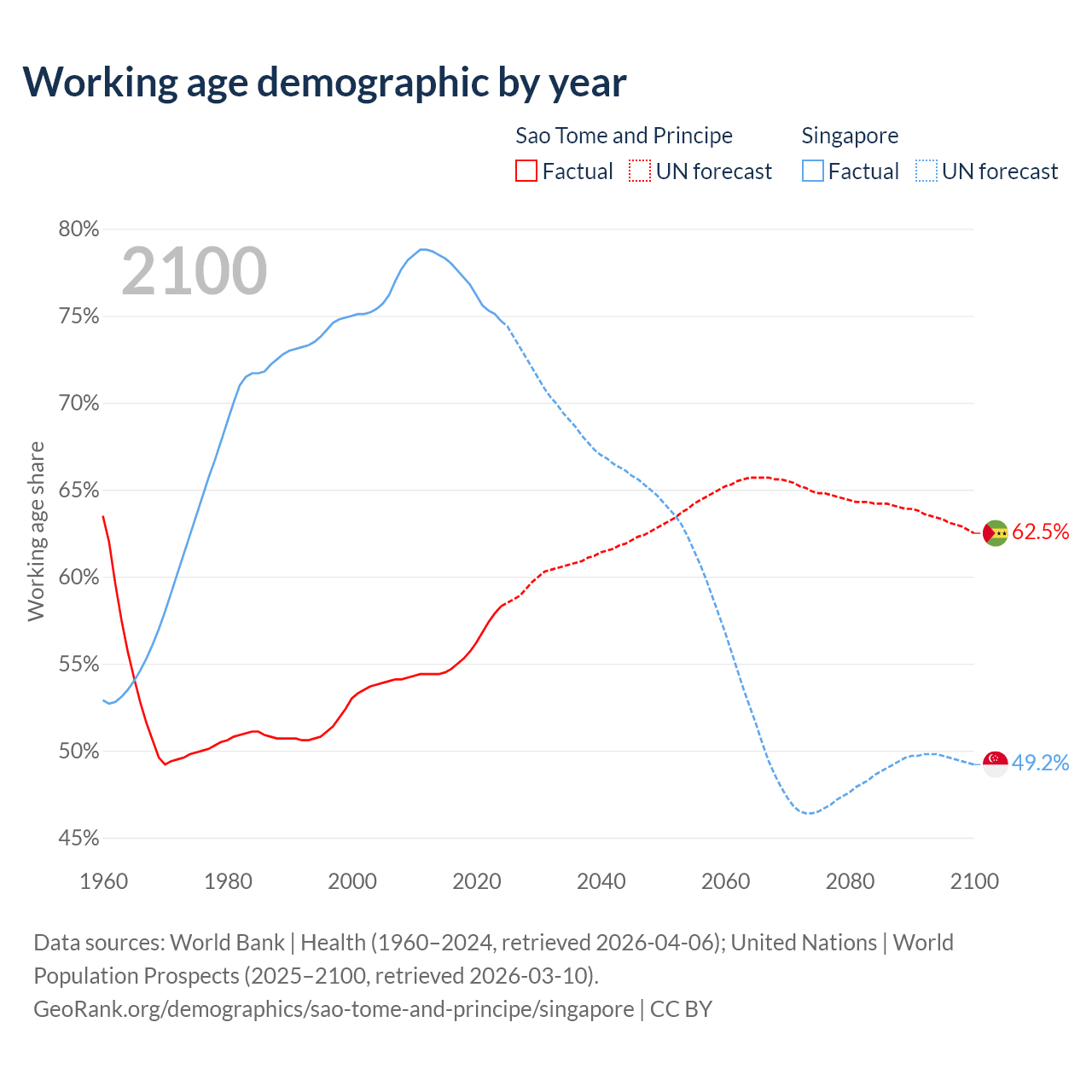 - Sao Tome and Principe has 144K working age adults (aged 15-64) vs 4.57M in Singapore.