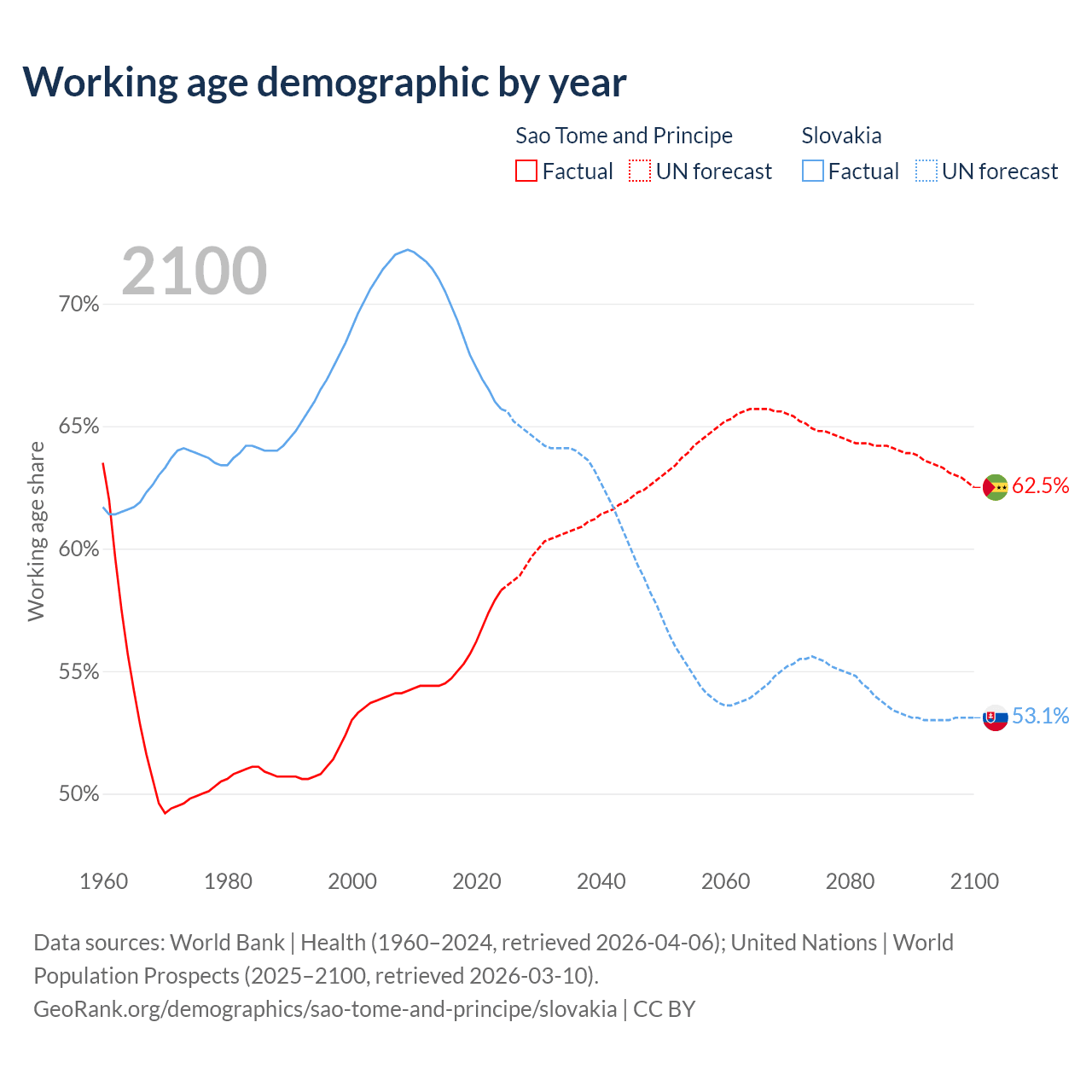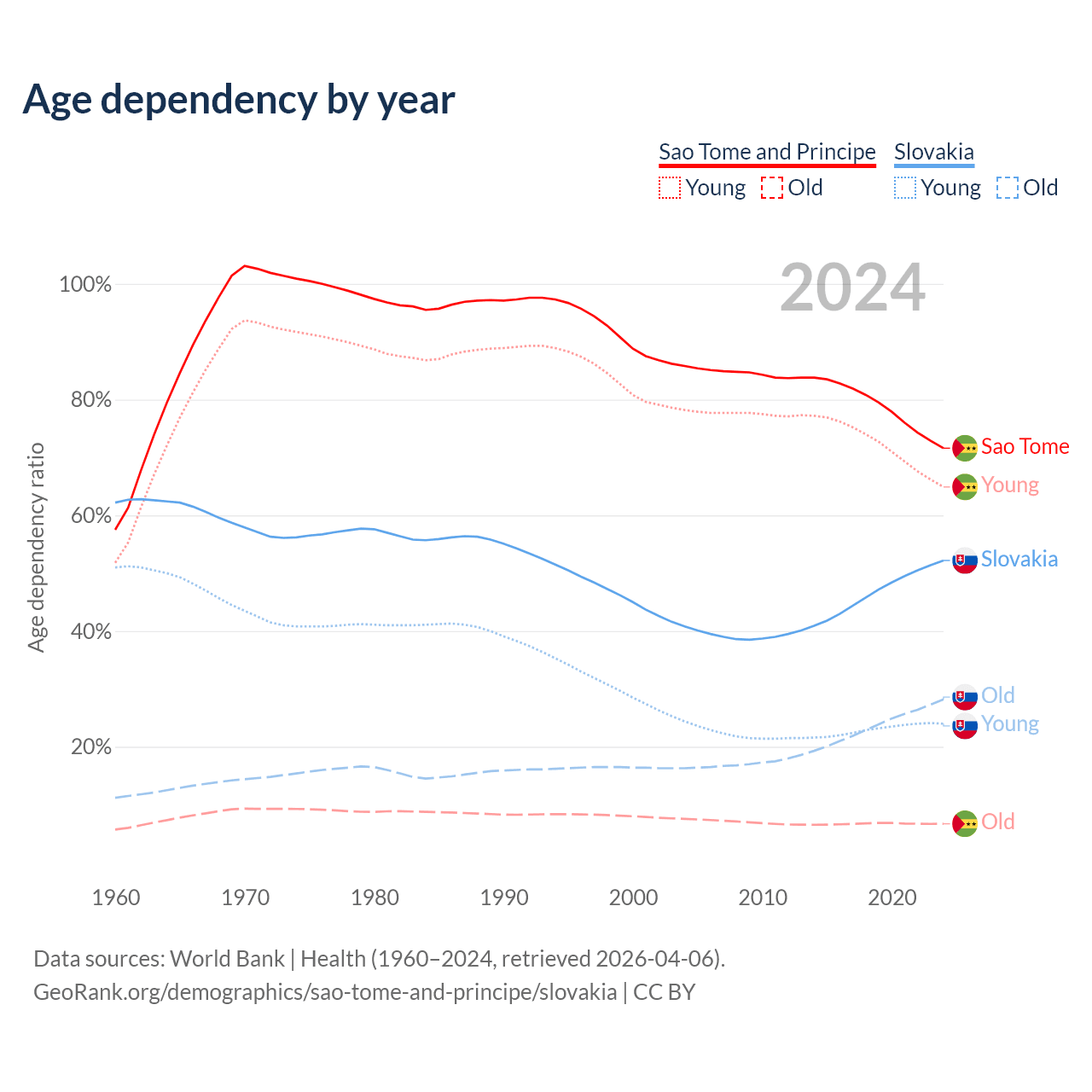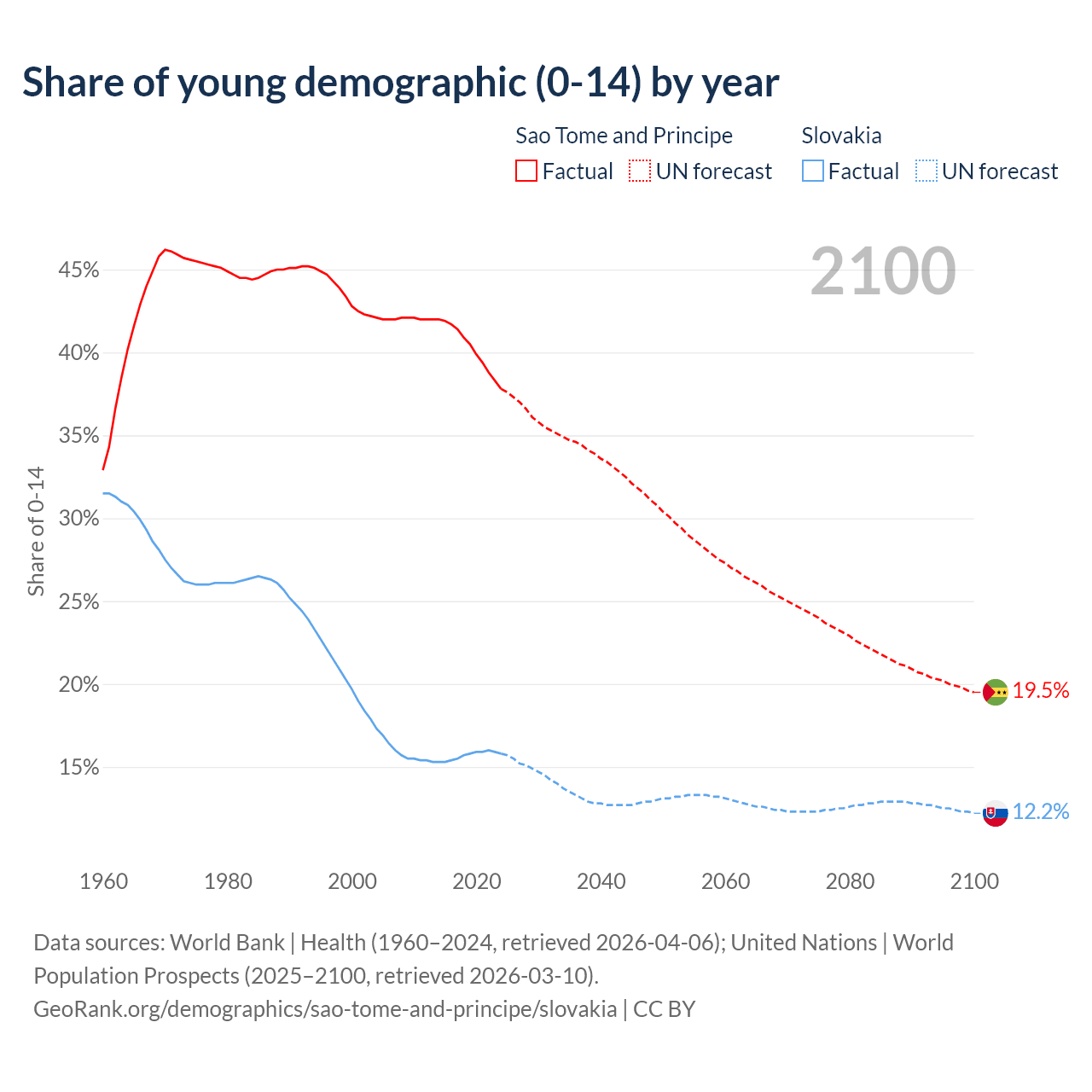 - The share of young demographic (0-15 years old) in Sao Tome and Principe is 37.8% vs 15.8% in Slovakia.