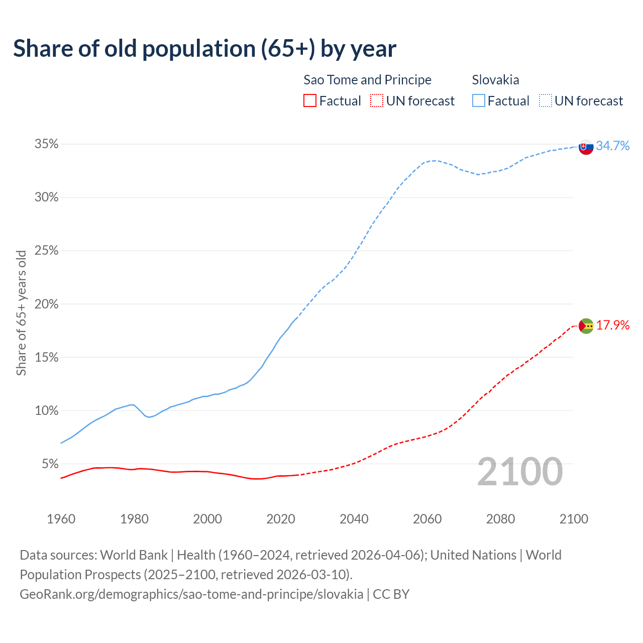 The share of older people aged 65 and over is 3.9% in Sao Tome and Principe and 18.5% in Slovakia. Life expectancy in Sao Tome and Principe compared to Slovakia .
