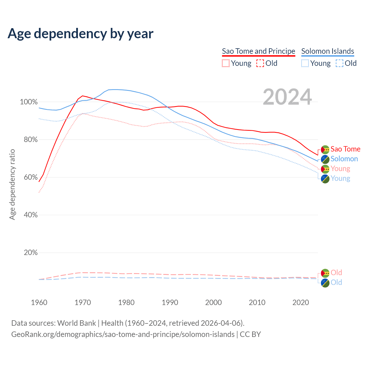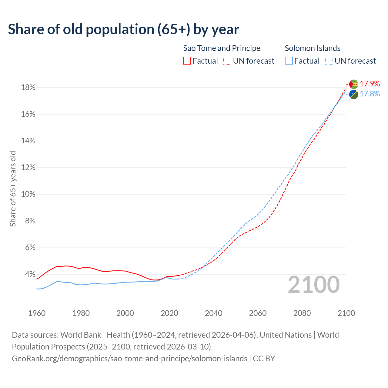 - The share of old-age demographic (65+) in Sao Tome and Principe is 3.9% vs 3.64% in the Solomon Islands.
