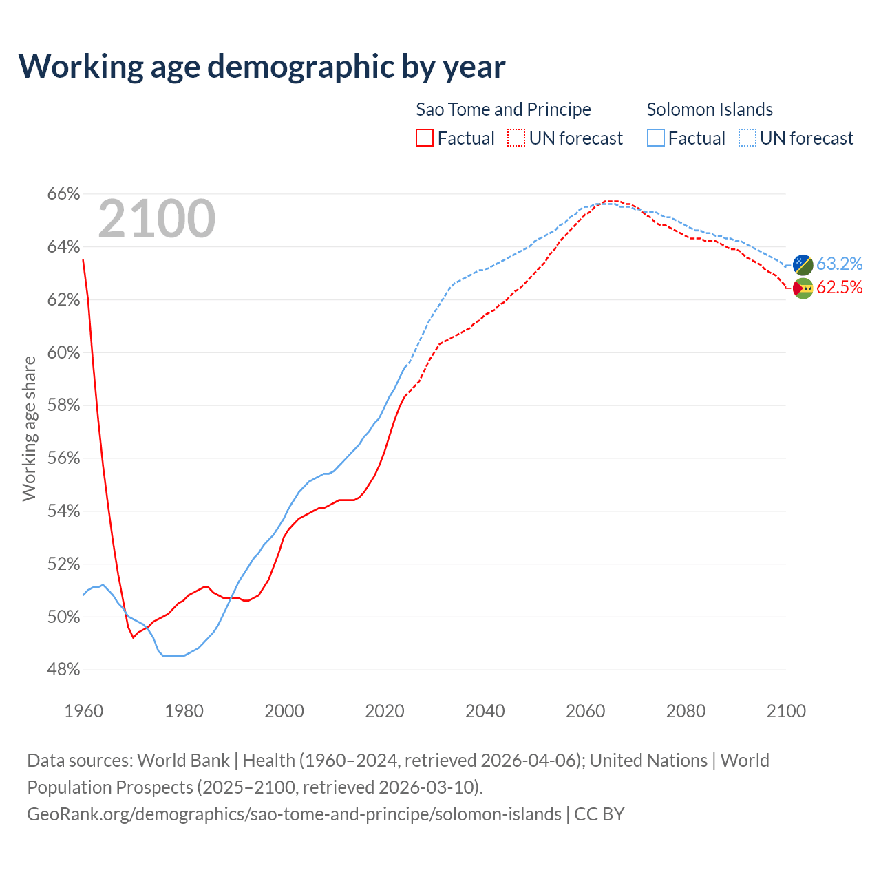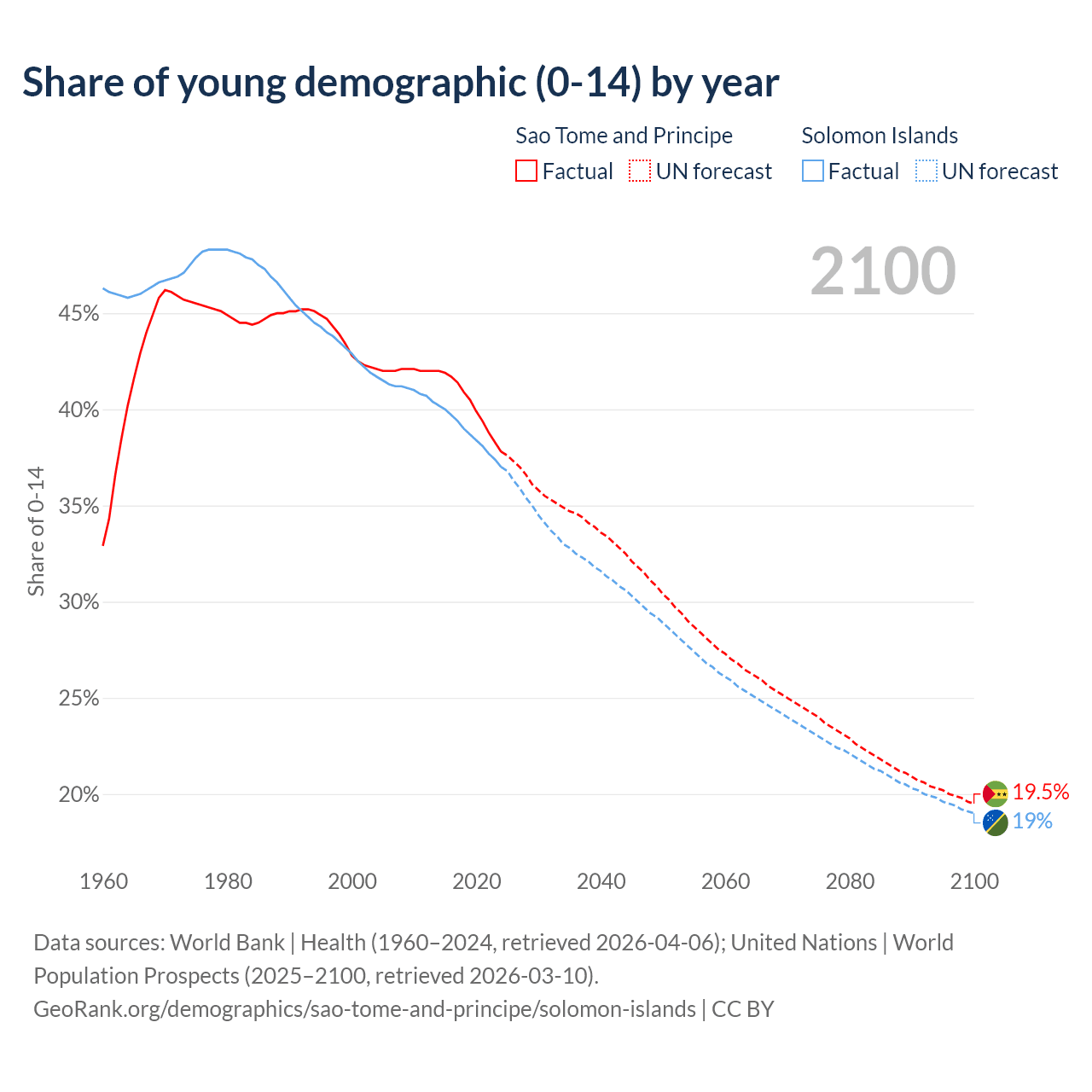 Median age Sao Tome and Principe vs Solomon Islands, 1960-2100