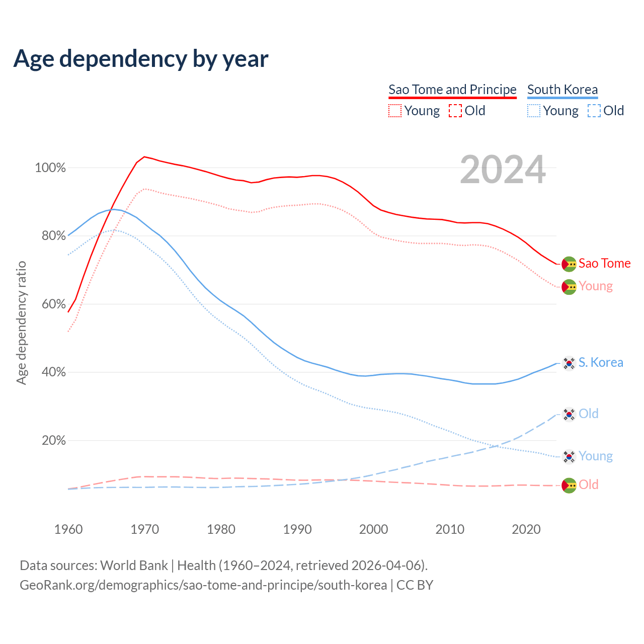 - The share of old-age demographic (65+) in Sao Tome and Principe is 3.9% vs 19.3% in South Korea.