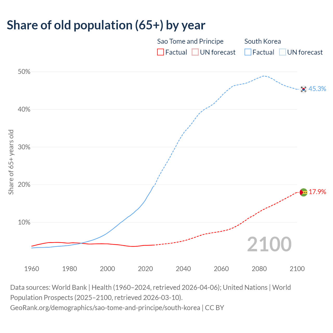 The share of older people aged 65 and over is 3.9% in Sao Tome and Principe and 19.3% in South Korea. Life expectancy in Sao Tome and Principe compared to South Korea .
