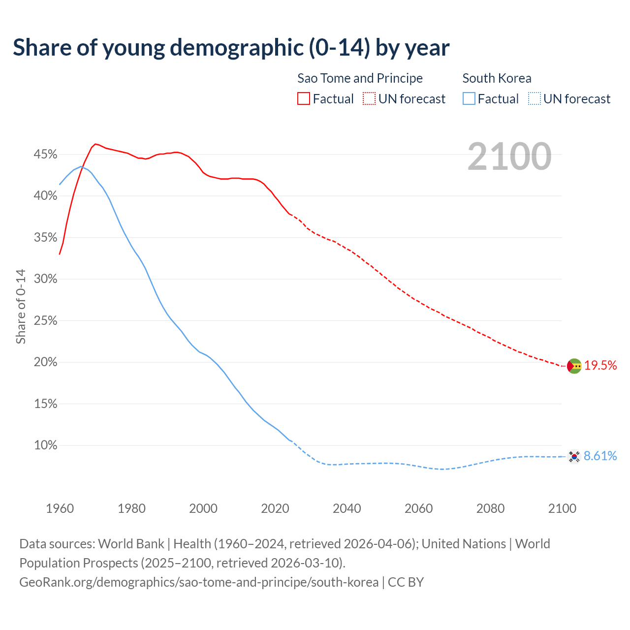 - The share of young demographic (0-15 years old) in Sao Tome and Principe is 37.8% vs 10.6% in South Korea.