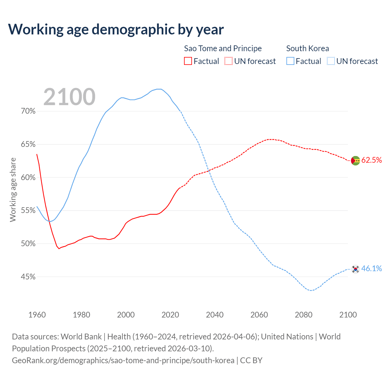 - Sao Tome and Principe has 144K working age adults (aged 15-64) vs 36.2M in South Korea.