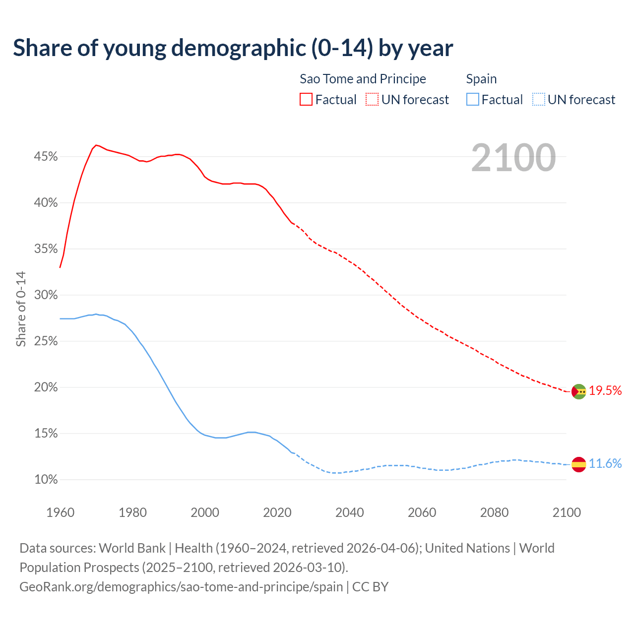 - The share of young demographic (0-15 years old) in Sao Tome and Principe is 37.8% vs 12.9% in Spain.
