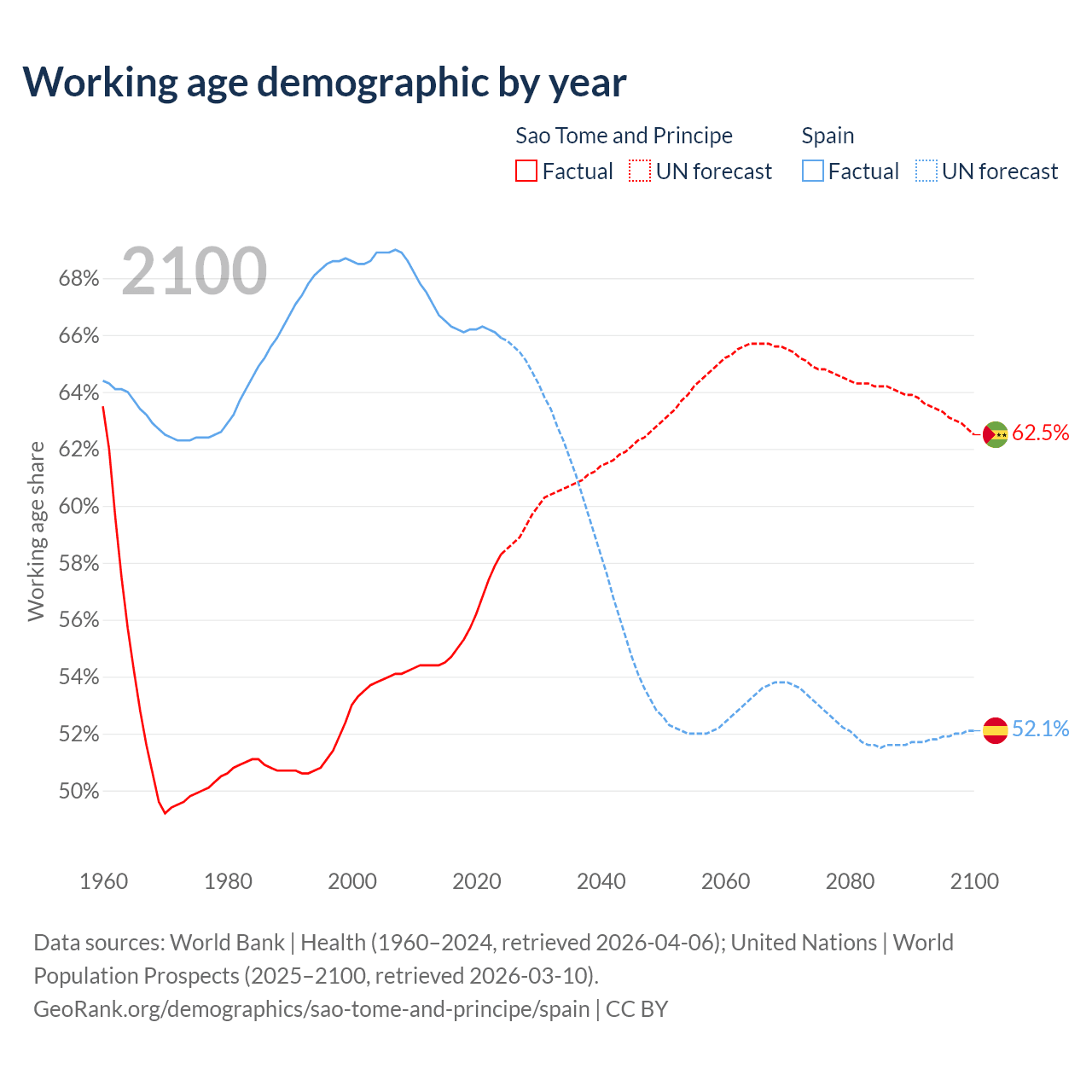 Median age Sao Tome and Principe vs Spain, 1960-2100
