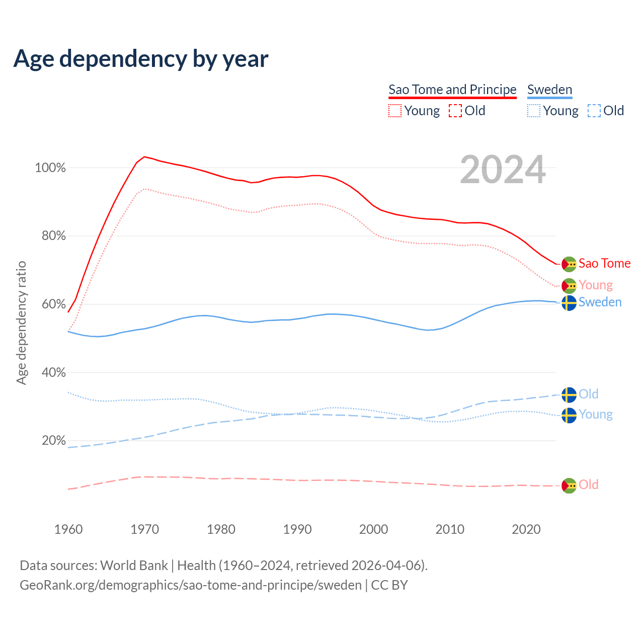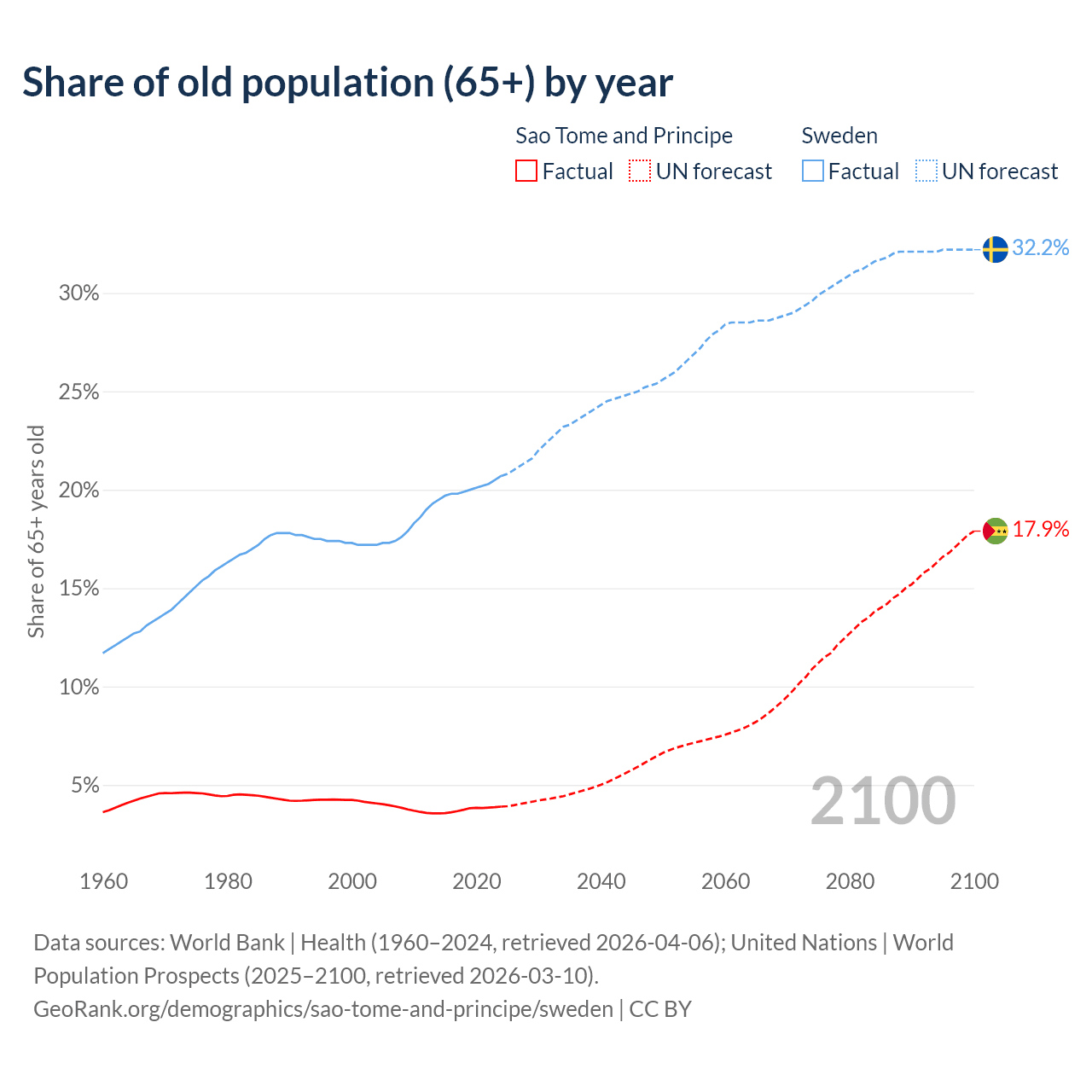 - The share of old-age demographic (65+) in Sao Tome and Principe is 3.9% vs 20.7% in Sweden.