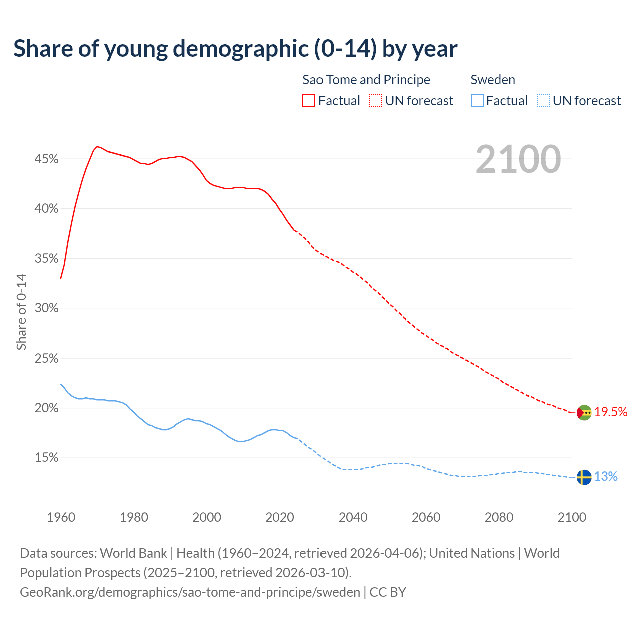 - The share of young demographic (0-15 years old) in Sao Tome and Principe is 37.8% vs 17% in Sweden.