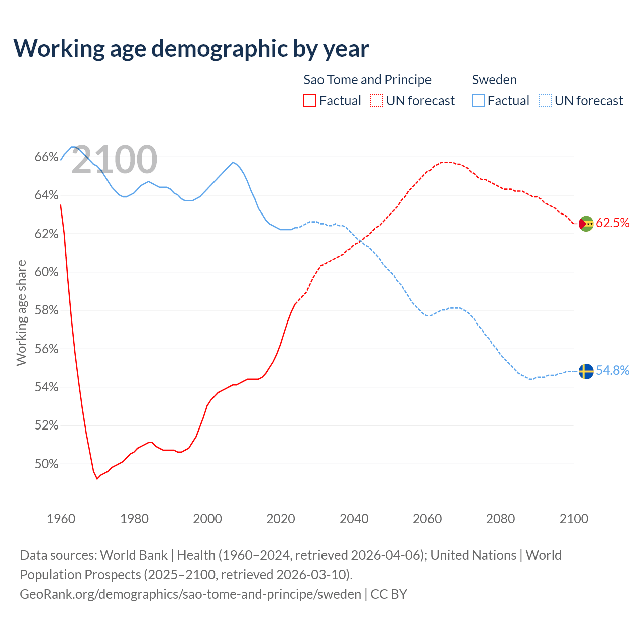 - Sao Tome and Principe has 144K working age adults (aged 15-64) vs 6.65M in Sweden.