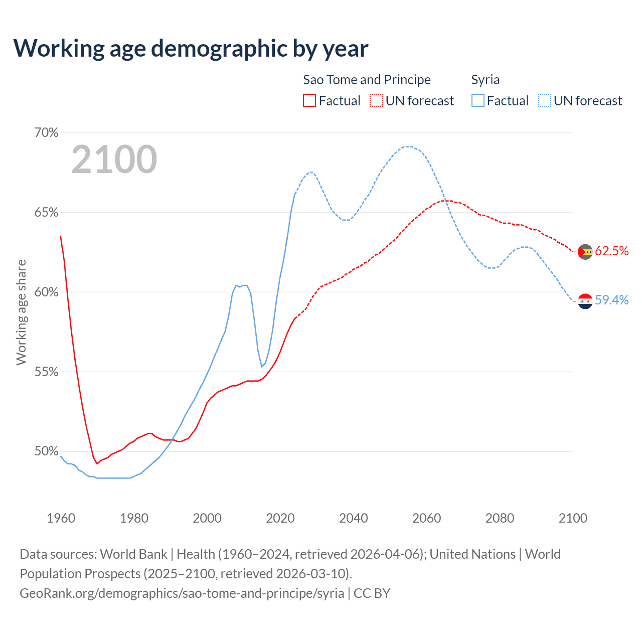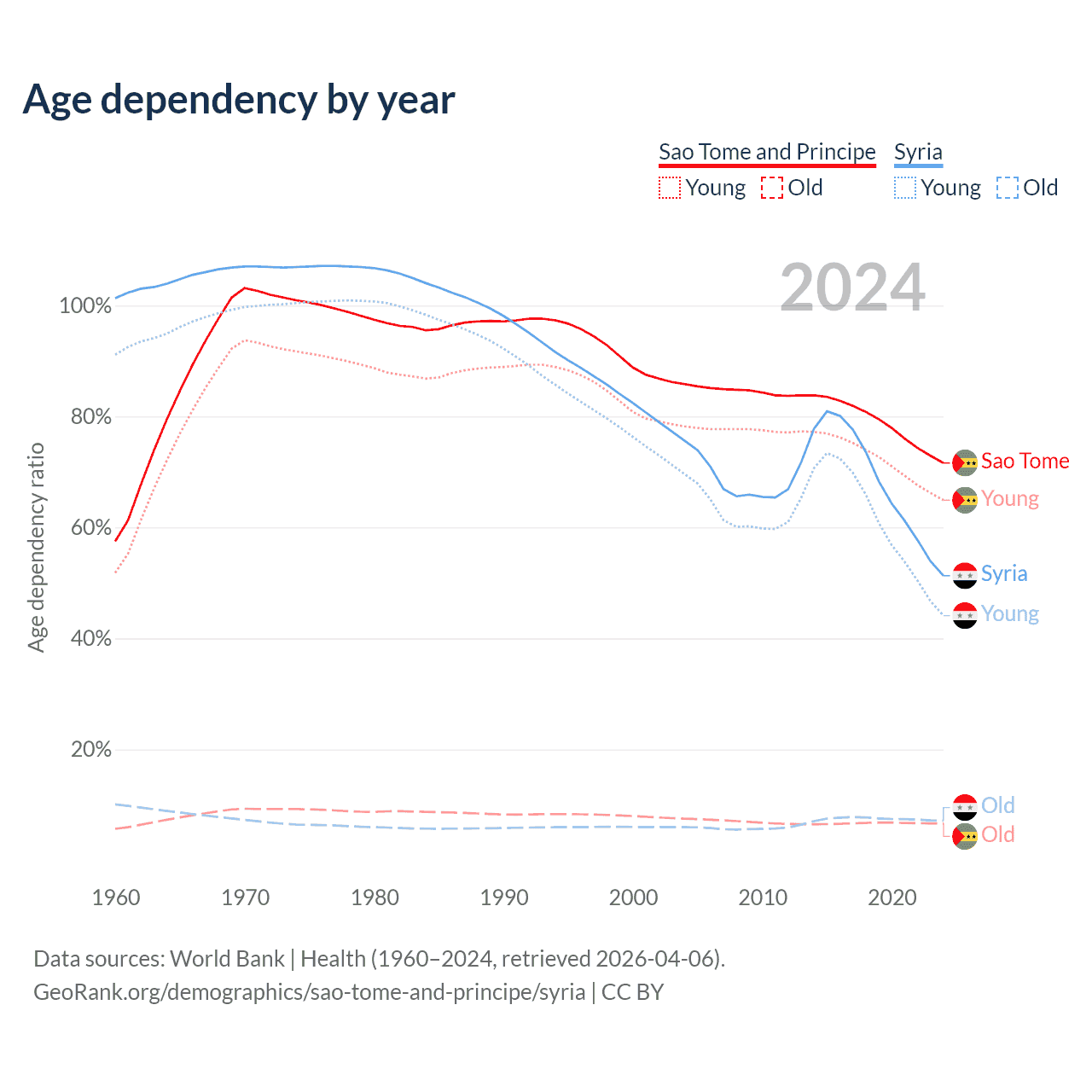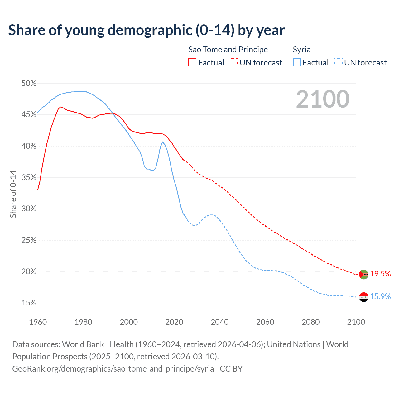 - The share of young demographic (0-15 years old) in Sao Tome and Principe is 37.8% vs 29.2% in Syria.