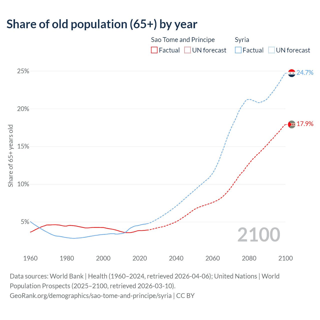 - The share of old-age demographic (65+) in Sao Tome and Principe is 3.9% vs 4.74% in Syria.