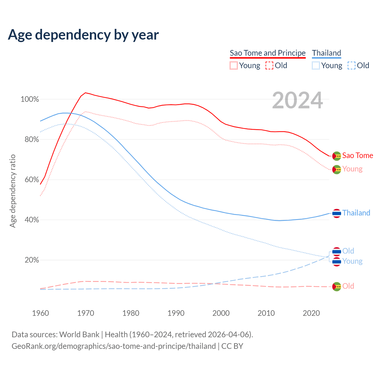- Sao Tome and Principe is ranked 163/196 by median age (oldest to youngest) vs 40/196 for Thailand.