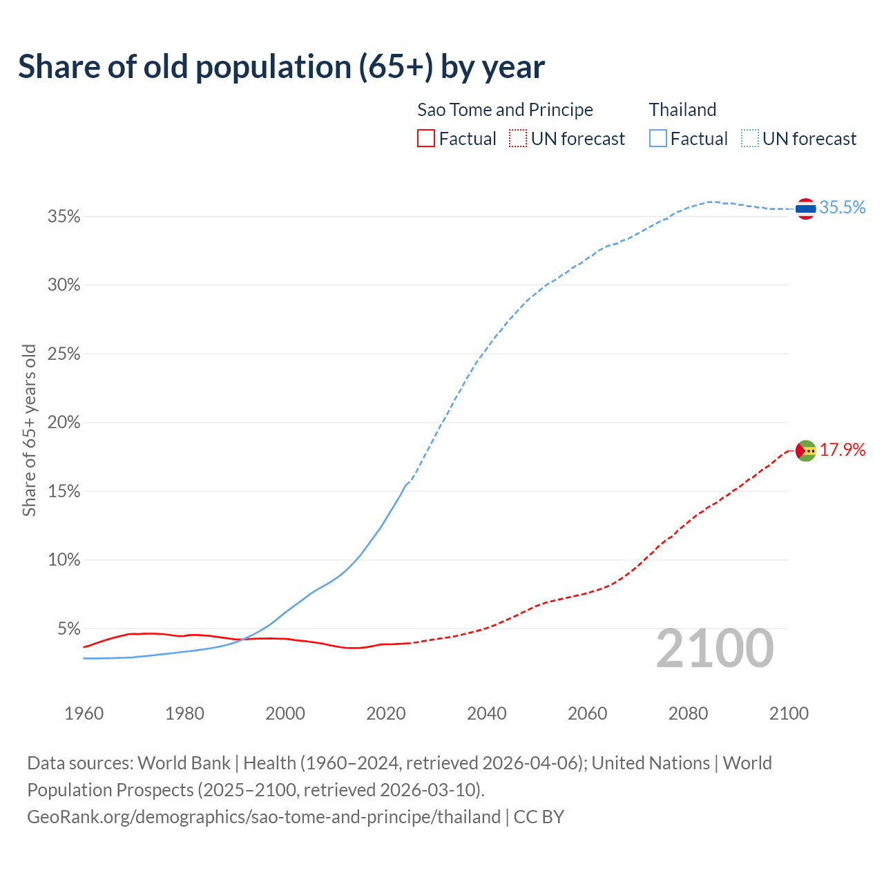 The share of older people aged 65 and over is 3.9% in Sao Tome and Principe and 15.4% in Thailand. Life expectancy in Sao Tome and Principe compared to Thailand .