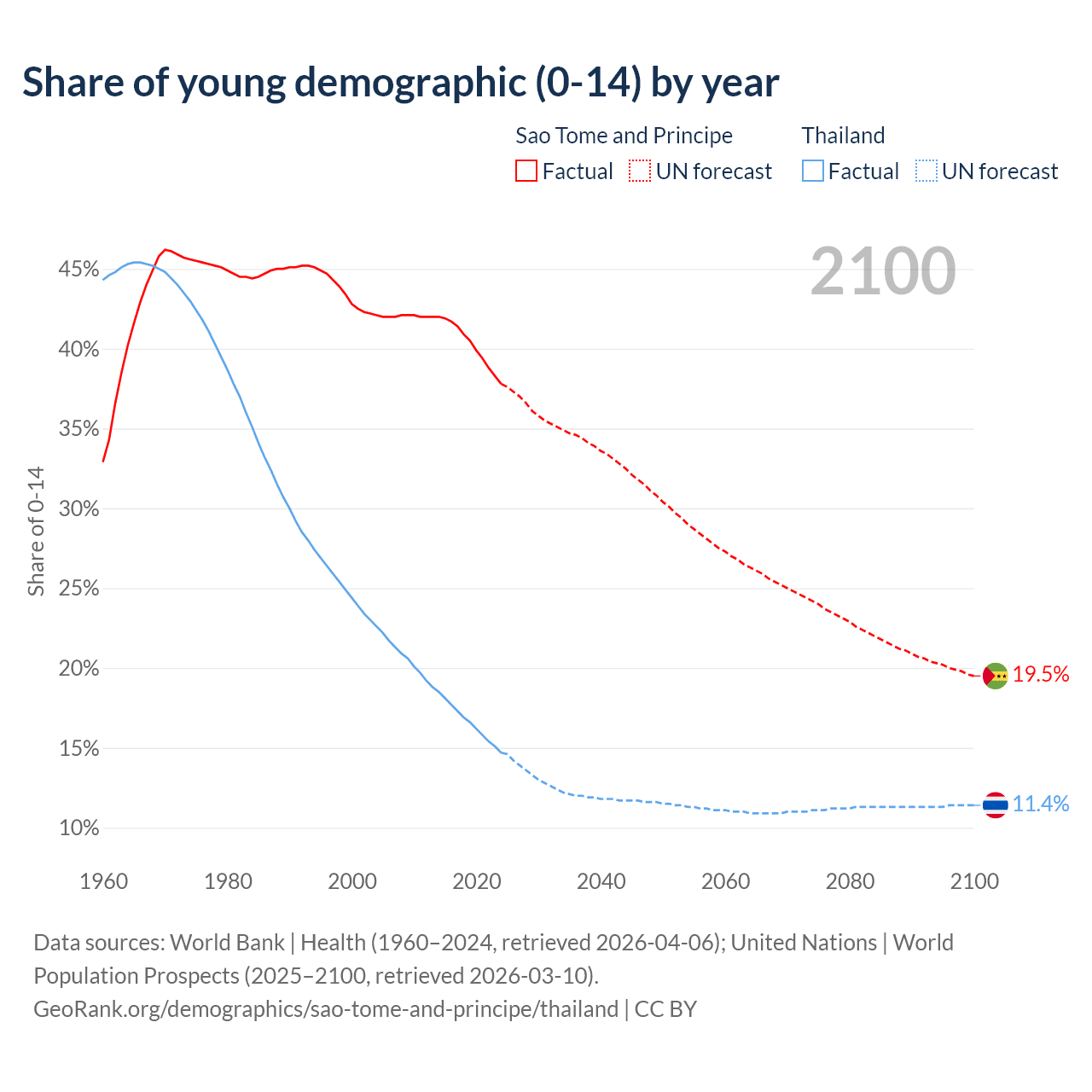 - The share of young demographic (0-15 years old) in Sao Tome and Principe is 37.8% vs 14.7% in Thailand.