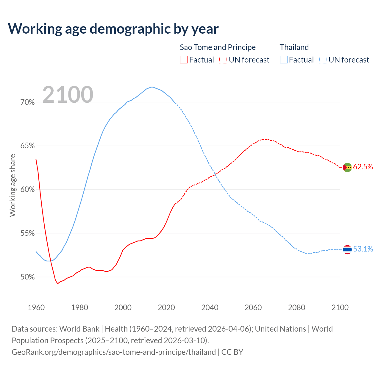 - Sao Tome and Principe has 144K working age adults (aged 15-64) vs 50M in Thailand.