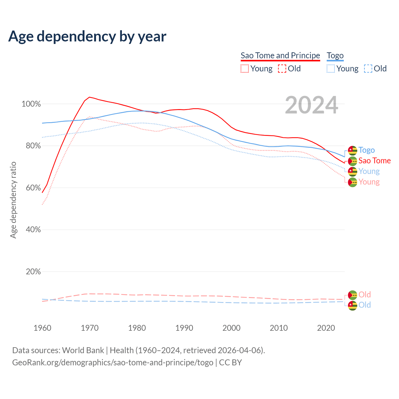 - Sao Tome and Principe is ranked 163/196 by median age (oldest to youngest) vs 166/196 for Togo.