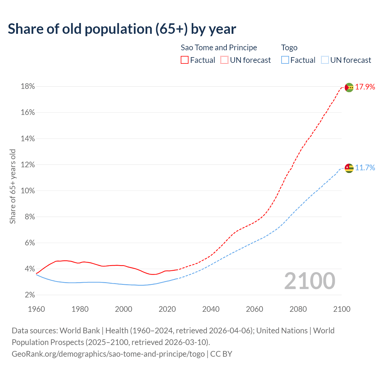 - The share of old-age demographic (65+) in Sao Tome and Principe is 3.9% vs 3.21% in Togo.