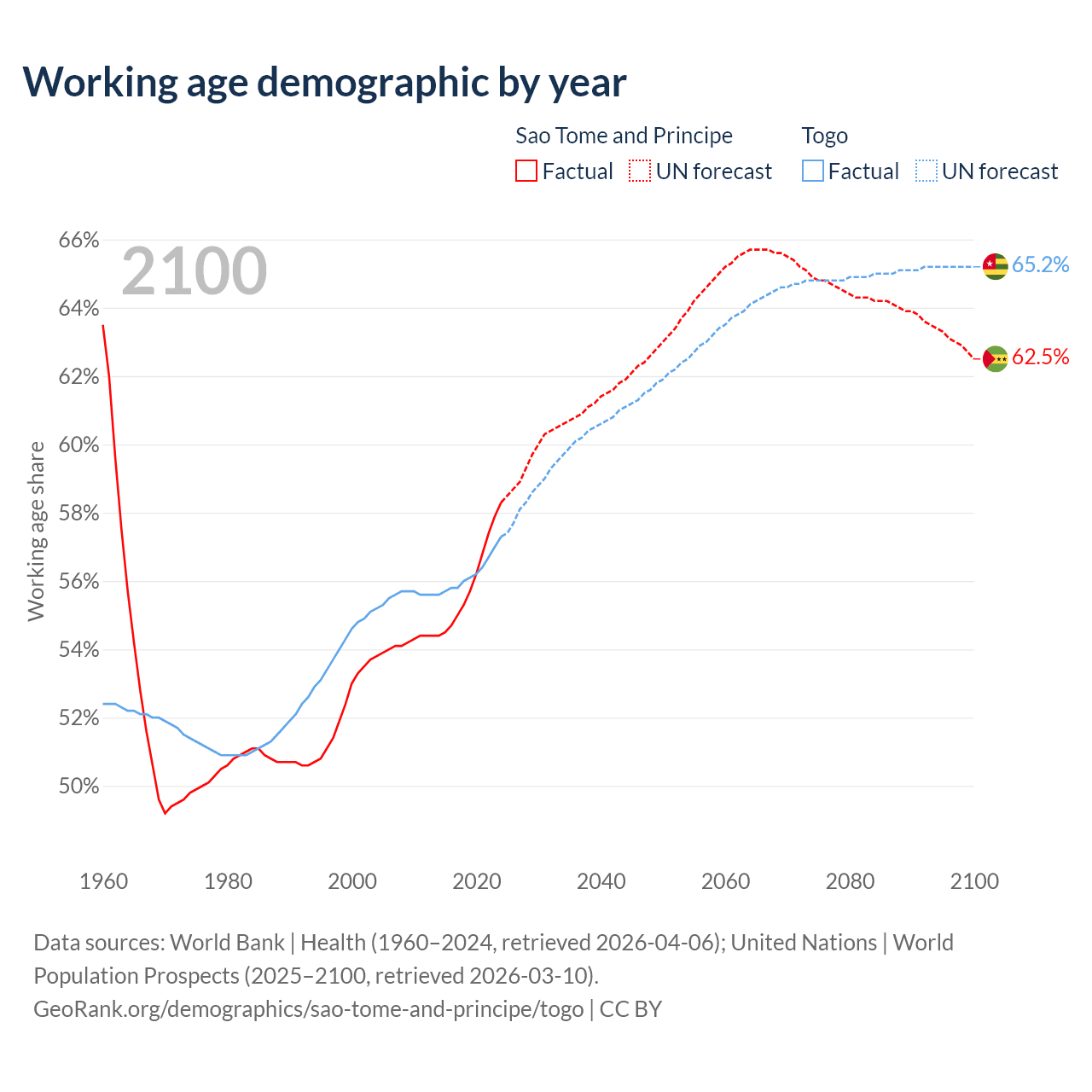 - Sao Tome and Principe has 144K working age adults (aged 15-64) vs 5.72M in Togo.