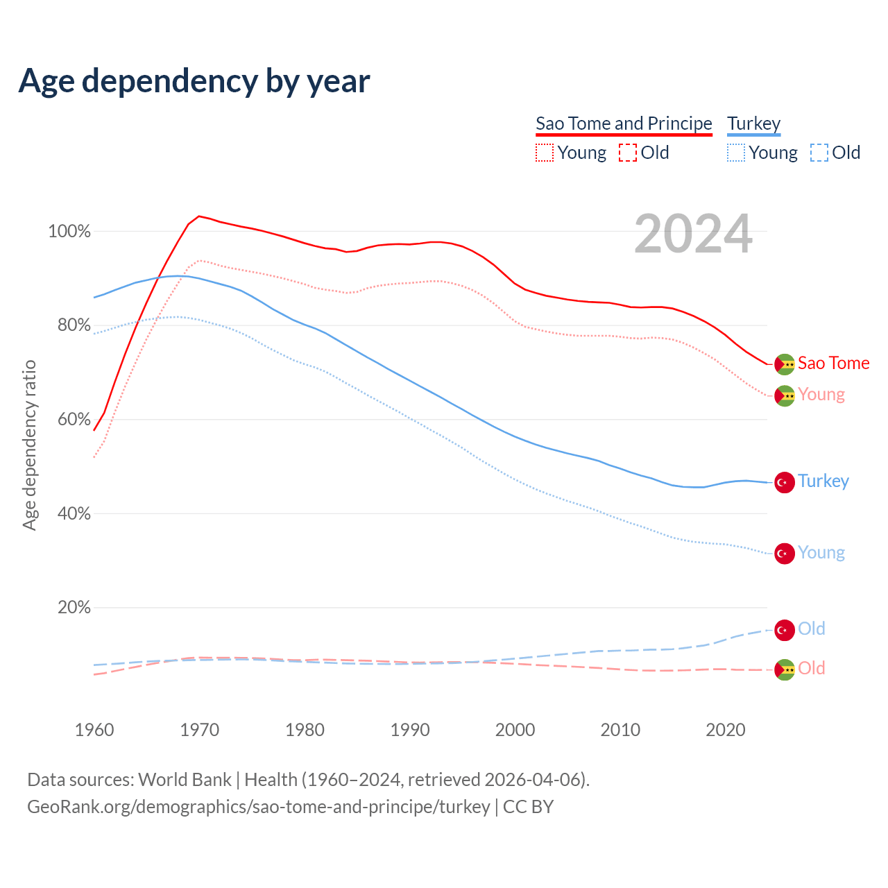 - Sao Tome and Principe is ranked 163/196 by median age (oldest to youngest) vs 83/196 for Turkey.