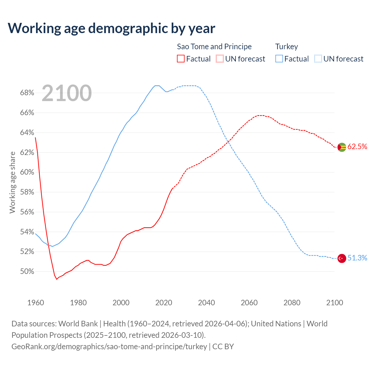 - Sao Tome and Principe has 144K working age adults (aged 15-64) vs 58.7M in Turkey.