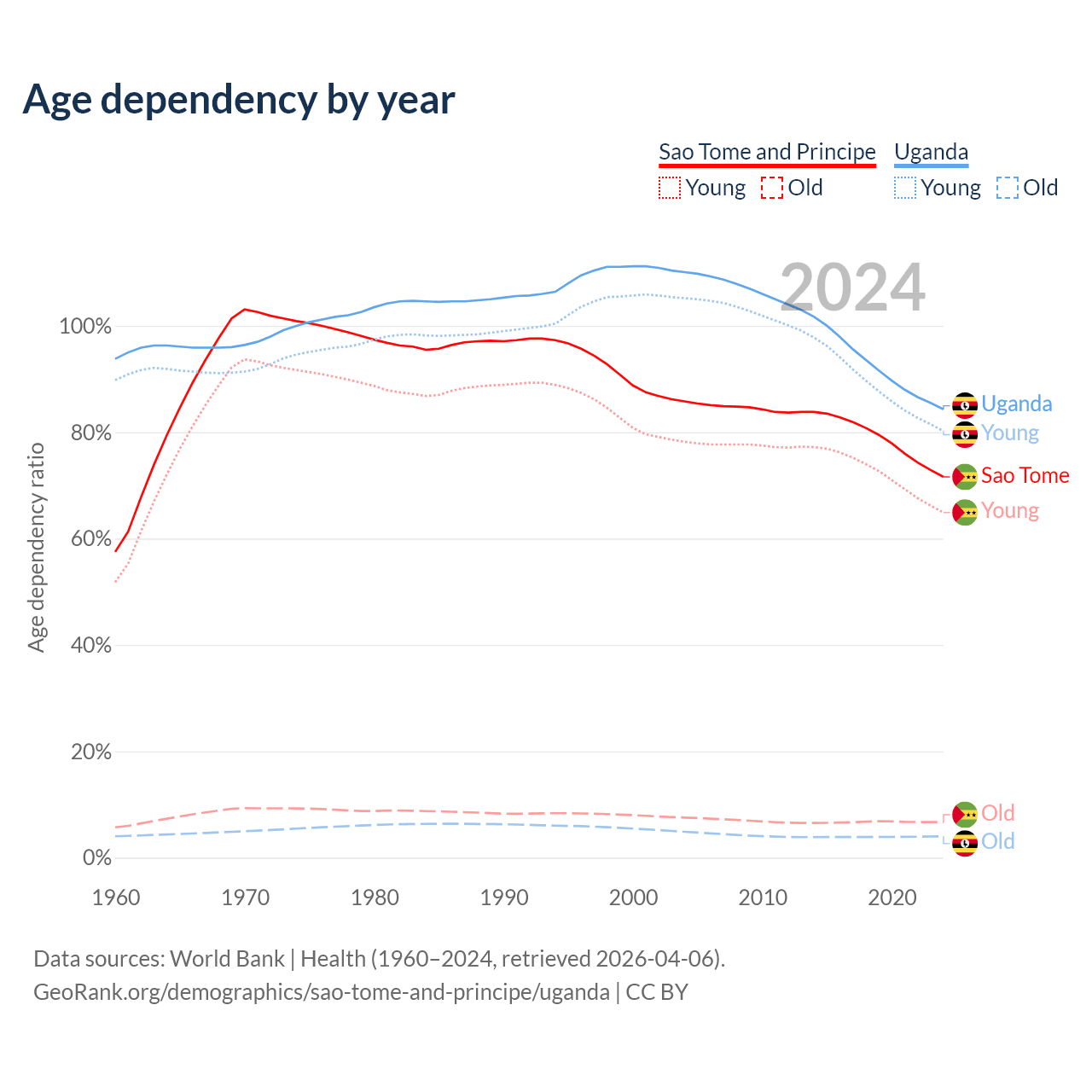 - Sao Tome and Principe is ranked 163/196 by median age (oldest to youngest) vs 187/196 for Uganda.