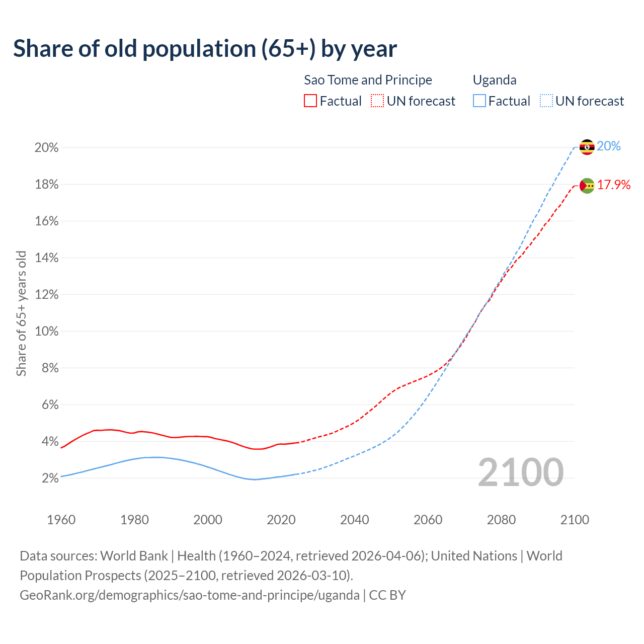 The share of older people aged 65 and over is 3.9% in Sao Tome and Principe and 2.19% in Uganda. Life expectancy in Sao Tome and Principe compared to Uganda .