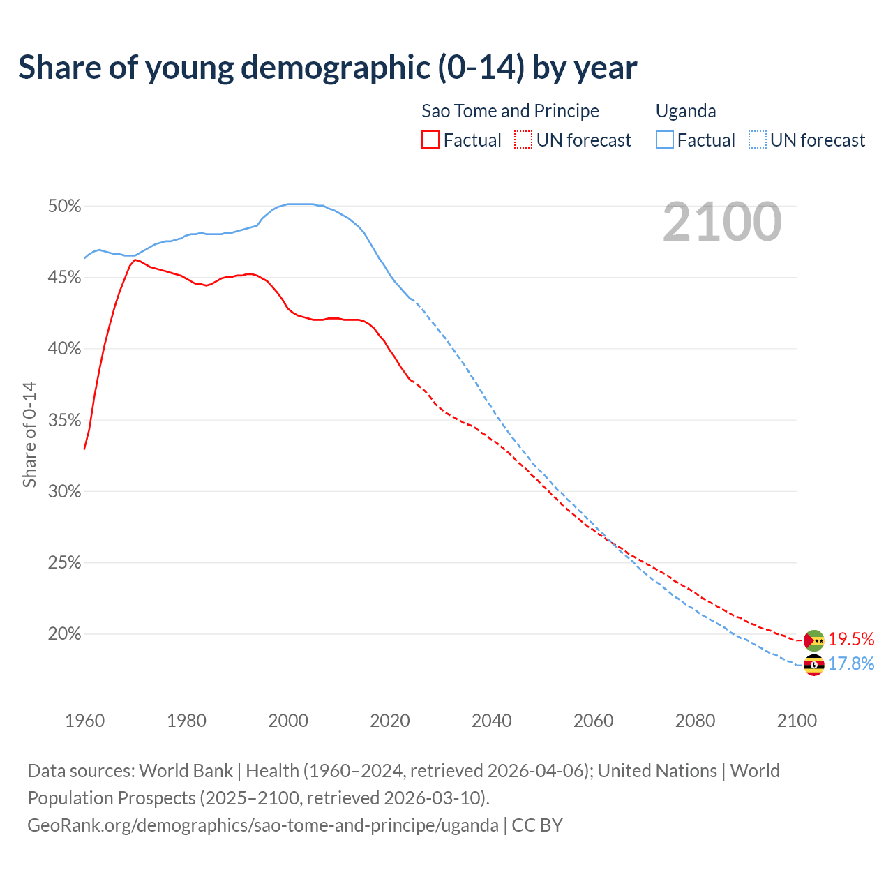 - The share of young demographic (0-15 years old) in Sao Tome and Principe is 37.8% vs 43.5% in Uganda.
