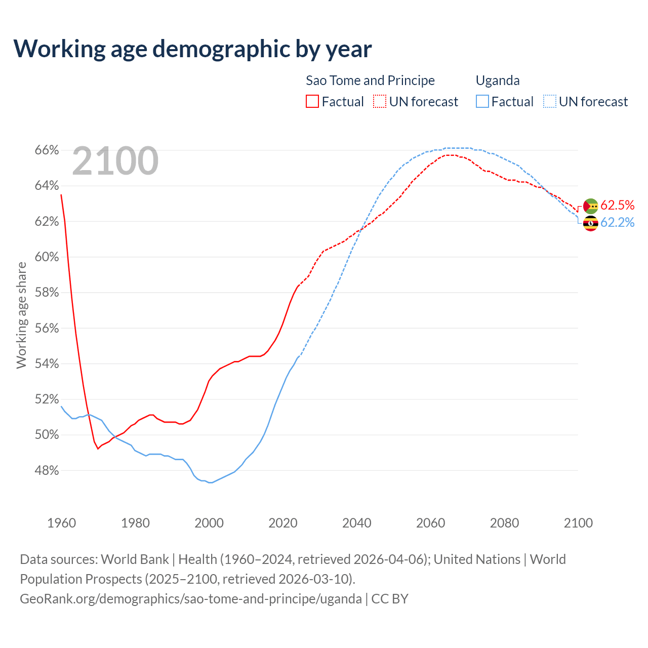 - Sao Tome and Principe has 144K working age adults (aged 15-64) vs 28.9M in Uganda.