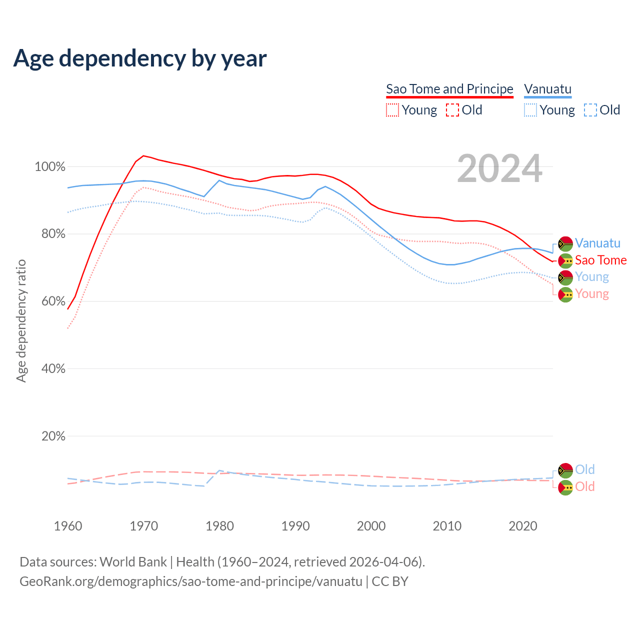 - Sao Tome and Principe is ranked 163/196 by median age (oldest to youngest) vs 156/196 for Vanuatu.
