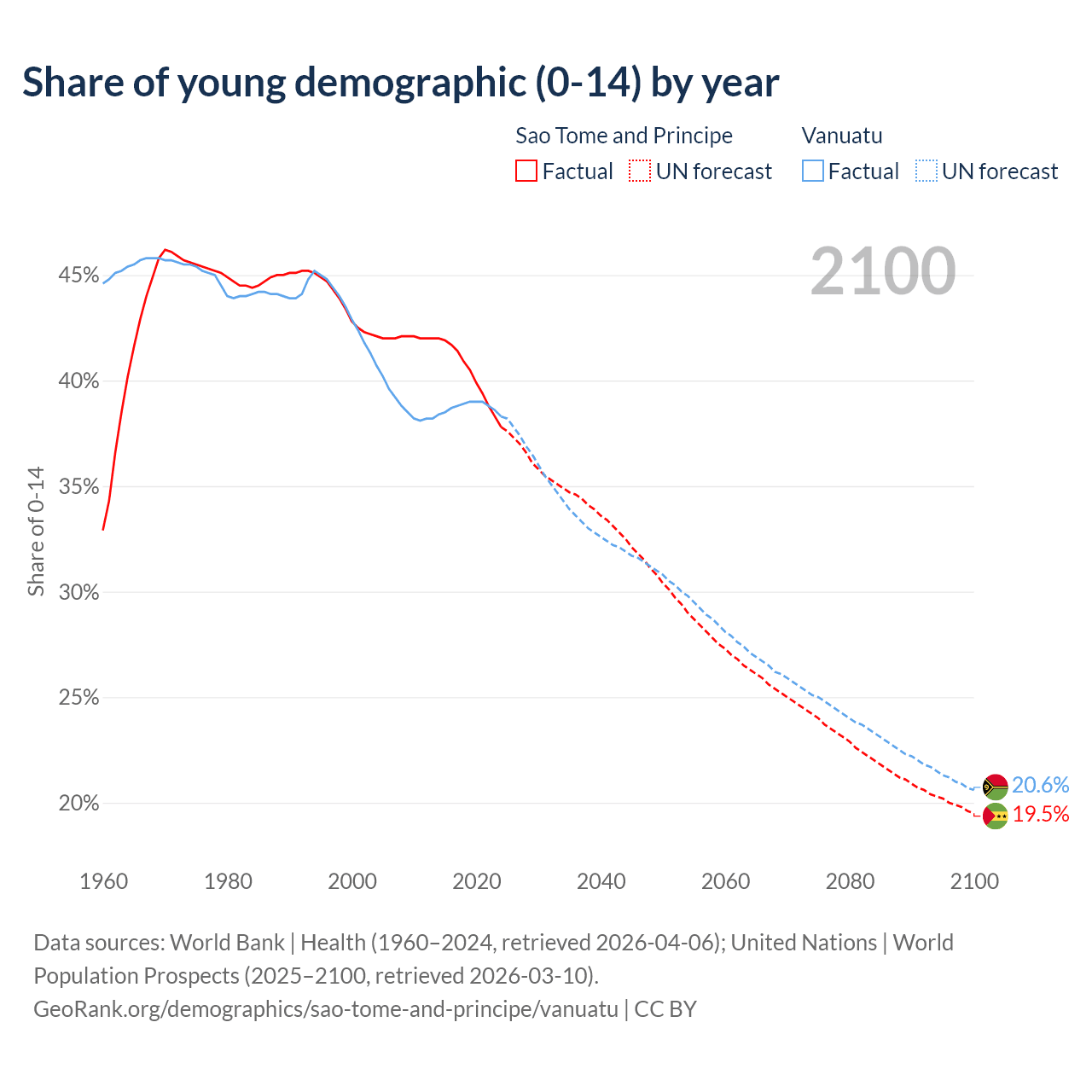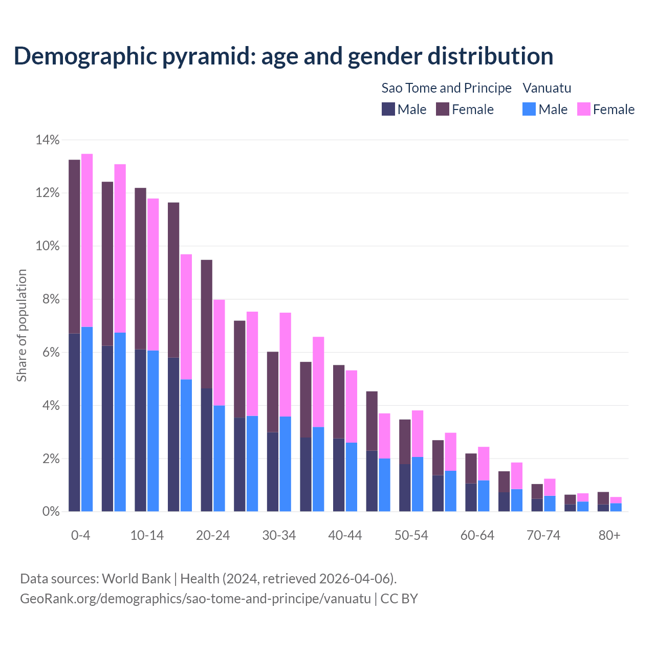 - The share of young demographic (0-15 years old) in Sao Tome and Principe is 37.8% vs 38.3% in Vanuatu.